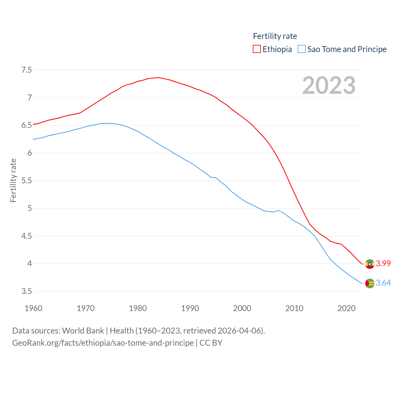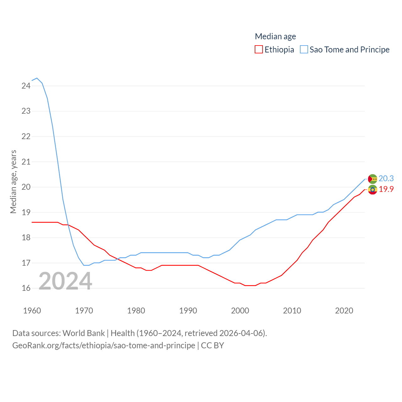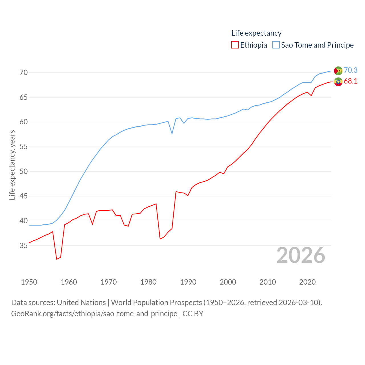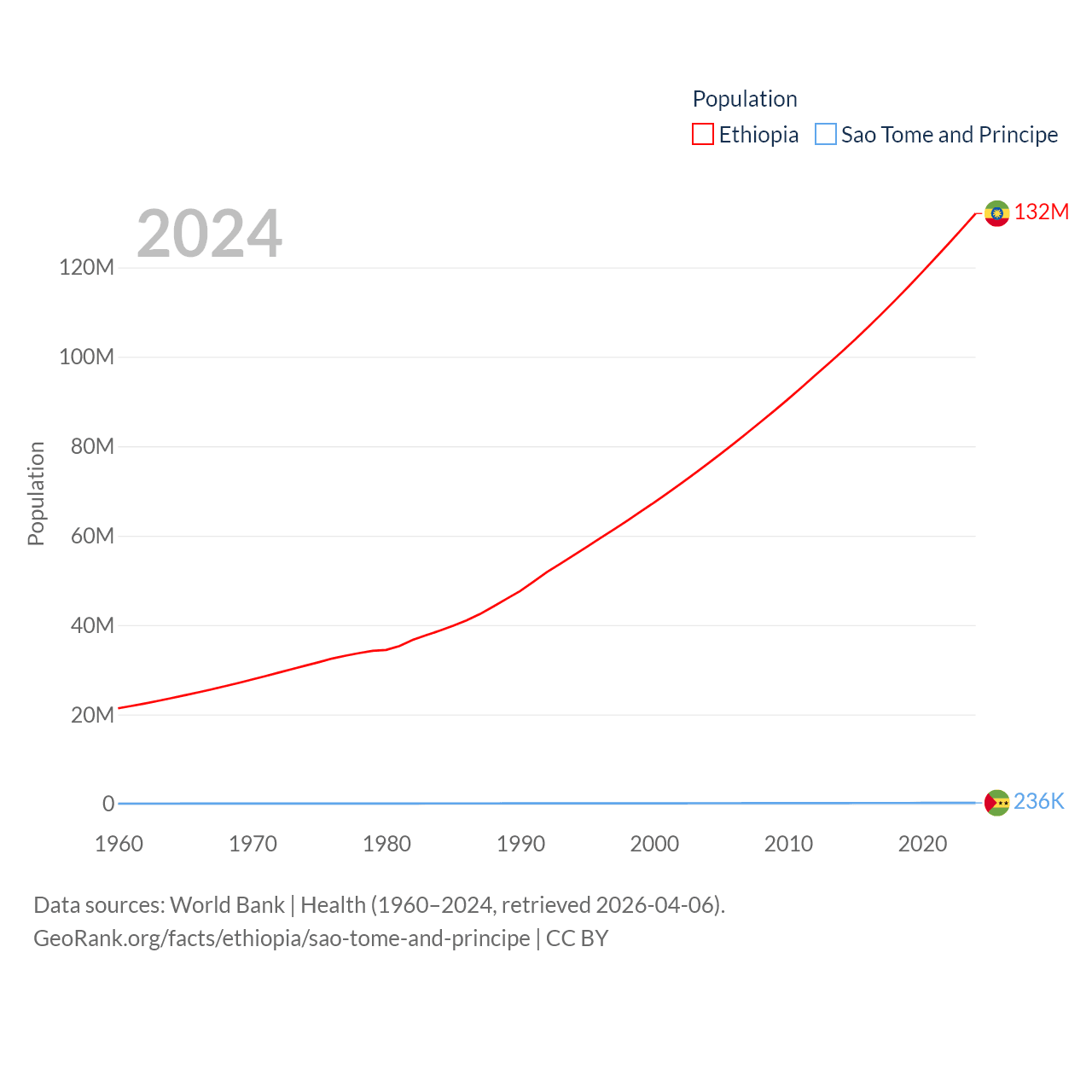 Ethiopia has a population of 132M (ranked 10/197), compared with 236K in Sao Tome and Principe (ranked 176/197). Ethiopia's land area is 435,716 sq mi versus 371 sq mi for Sao Tome and Principe (ranked 25th vs. 172nd).