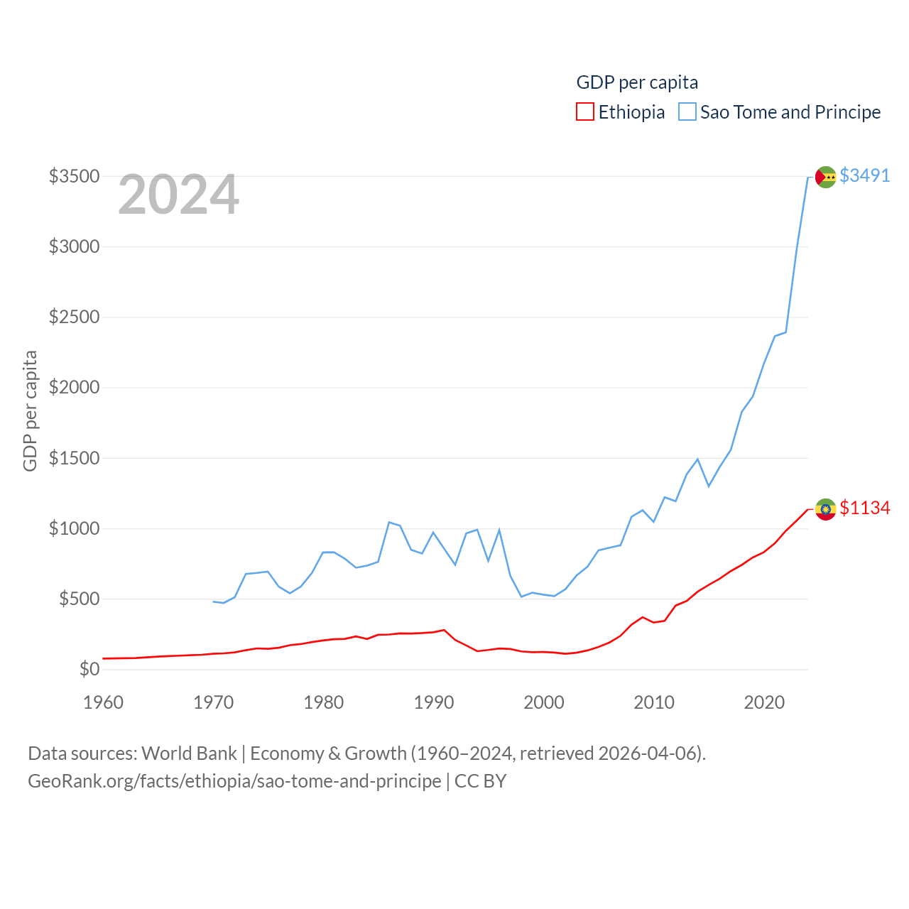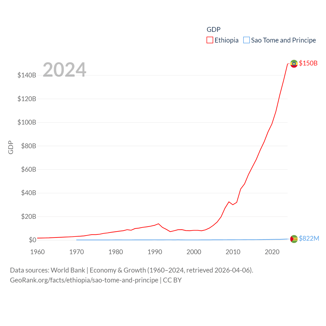 By GDP, Ethiopia ranks 60/197 ($150B) and Sao Tome and Principe ranks 189/197 ($822M). By GDP per capita, Ethiopia ranks 171/197 ($1,134), while Sao Tome and Principe ranks 134/197 ($3,491).