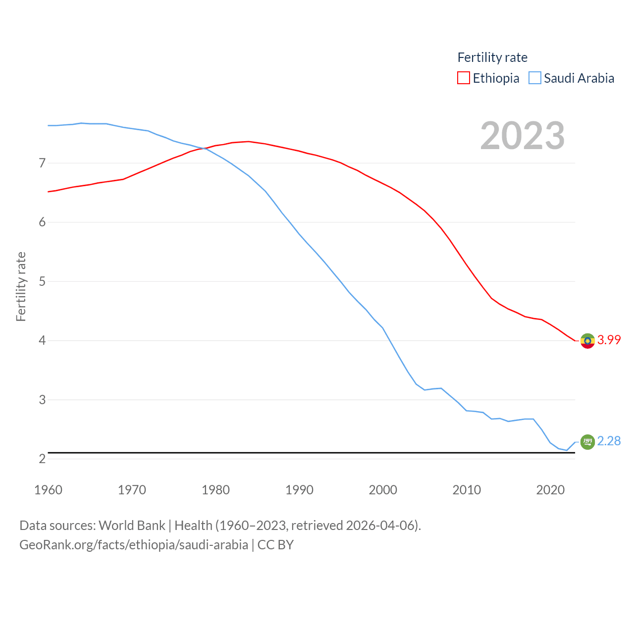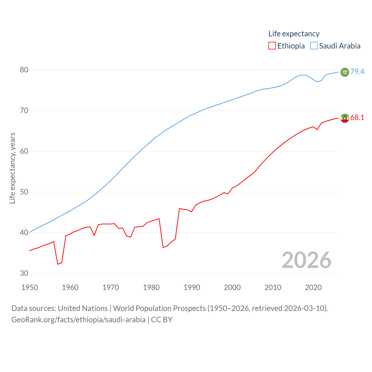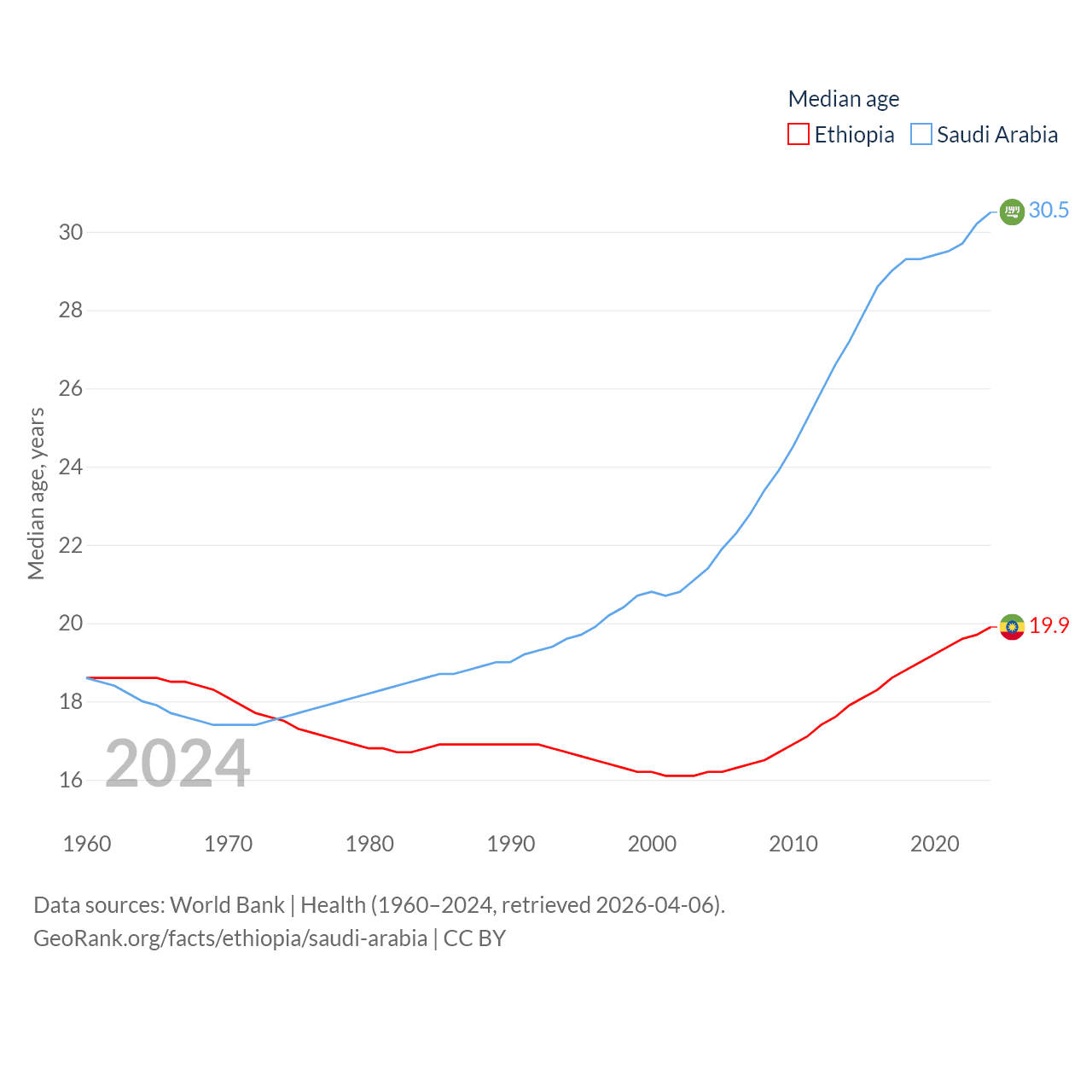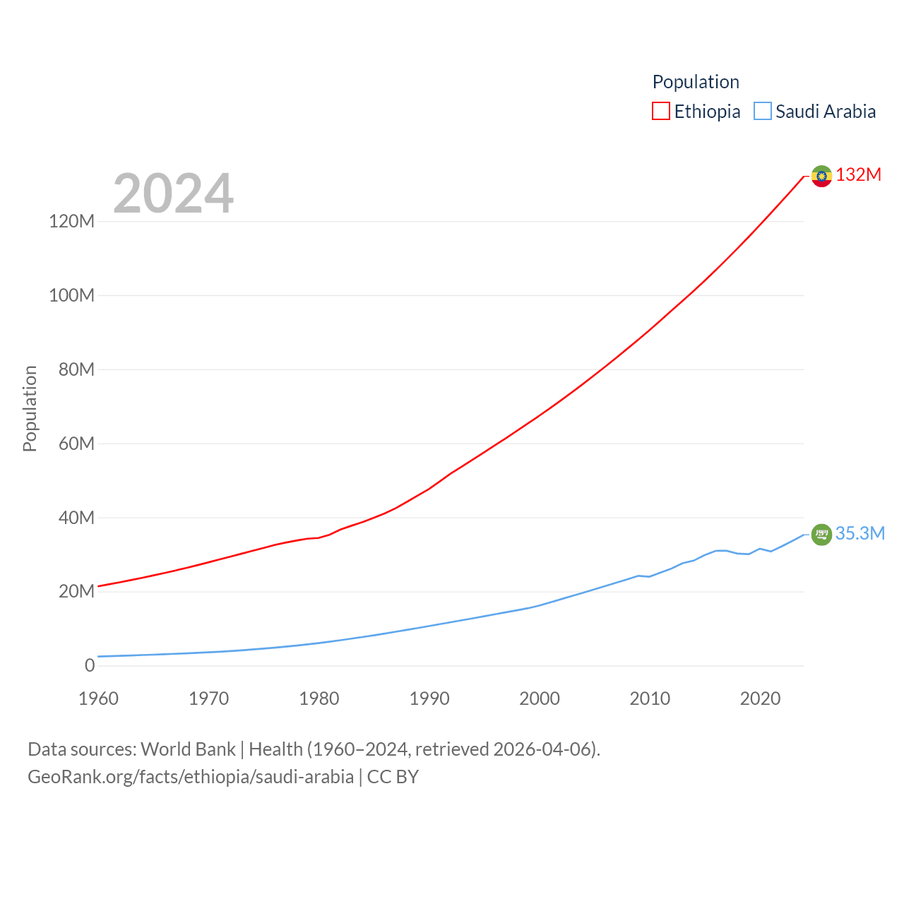 Ethiopia has a population of 132M (ranked 10/197), compared with 35.3M in Saudi Arabia (ranked 45/197). Ethiopia's land area is 435,716 sq mi versus 830,000 sq mi for Saudi Arabia (ranked 25th vs. 12th).