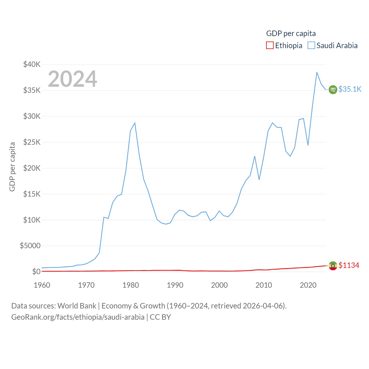 By GDP, Ethiopia ranks 60/197 ($150B) and Saudi Arabia ranks 18/197 ($1.24T). By GDP per capita, Ethiopia ranks 171/197 ($1,134), while Saudi Arabia ranks 33/197 ($35,122).