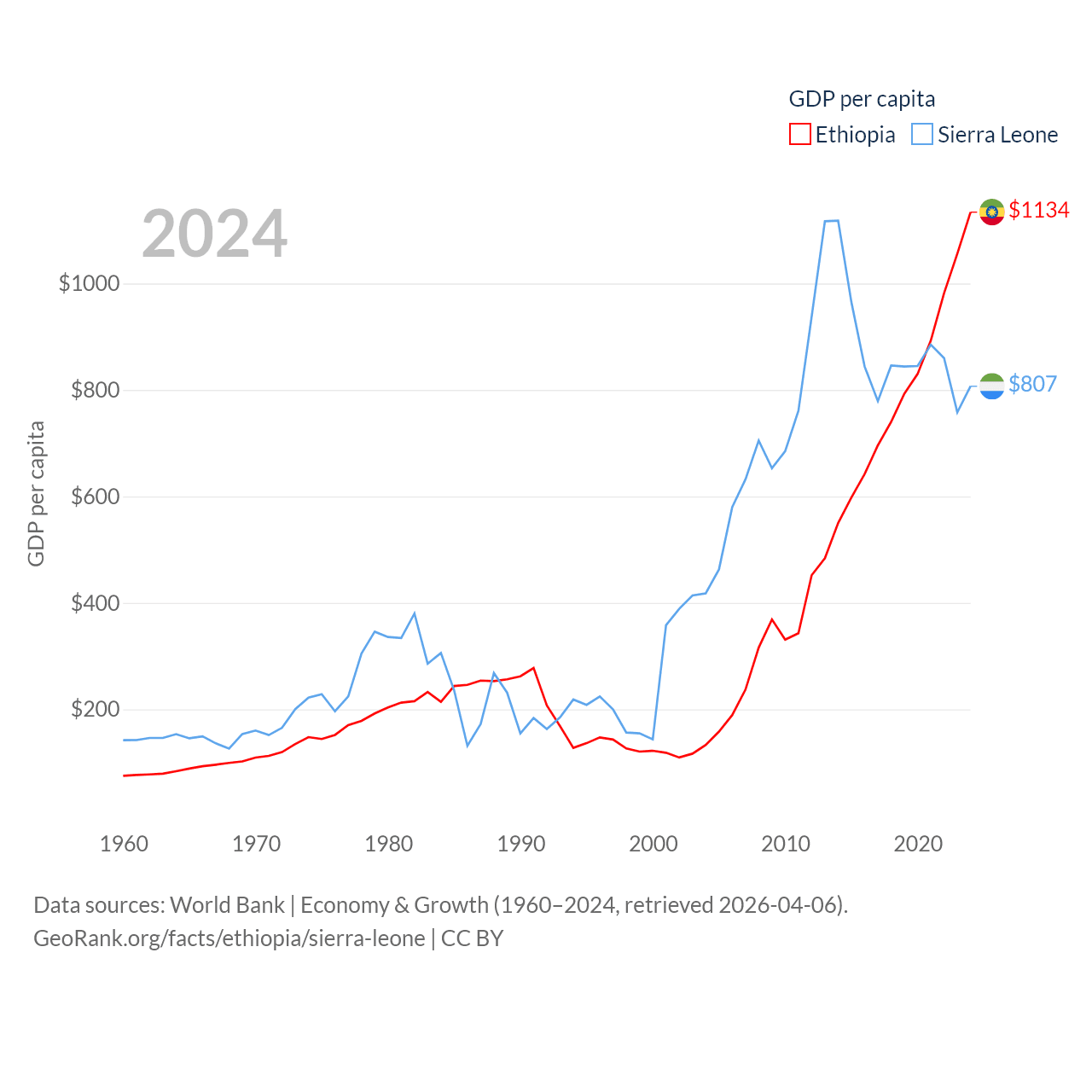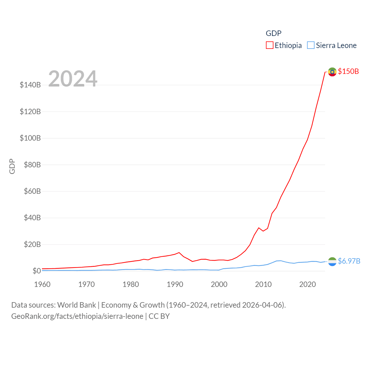 By GDP, Ethiopia ranks 60/197 ($150B) and Sierra Leone ranks 160/197 ($6.97B). By GDP per capita, Ethiopia ranks 171/197 ($1,134), while Sierra Leone ranks 186/197 ($807).