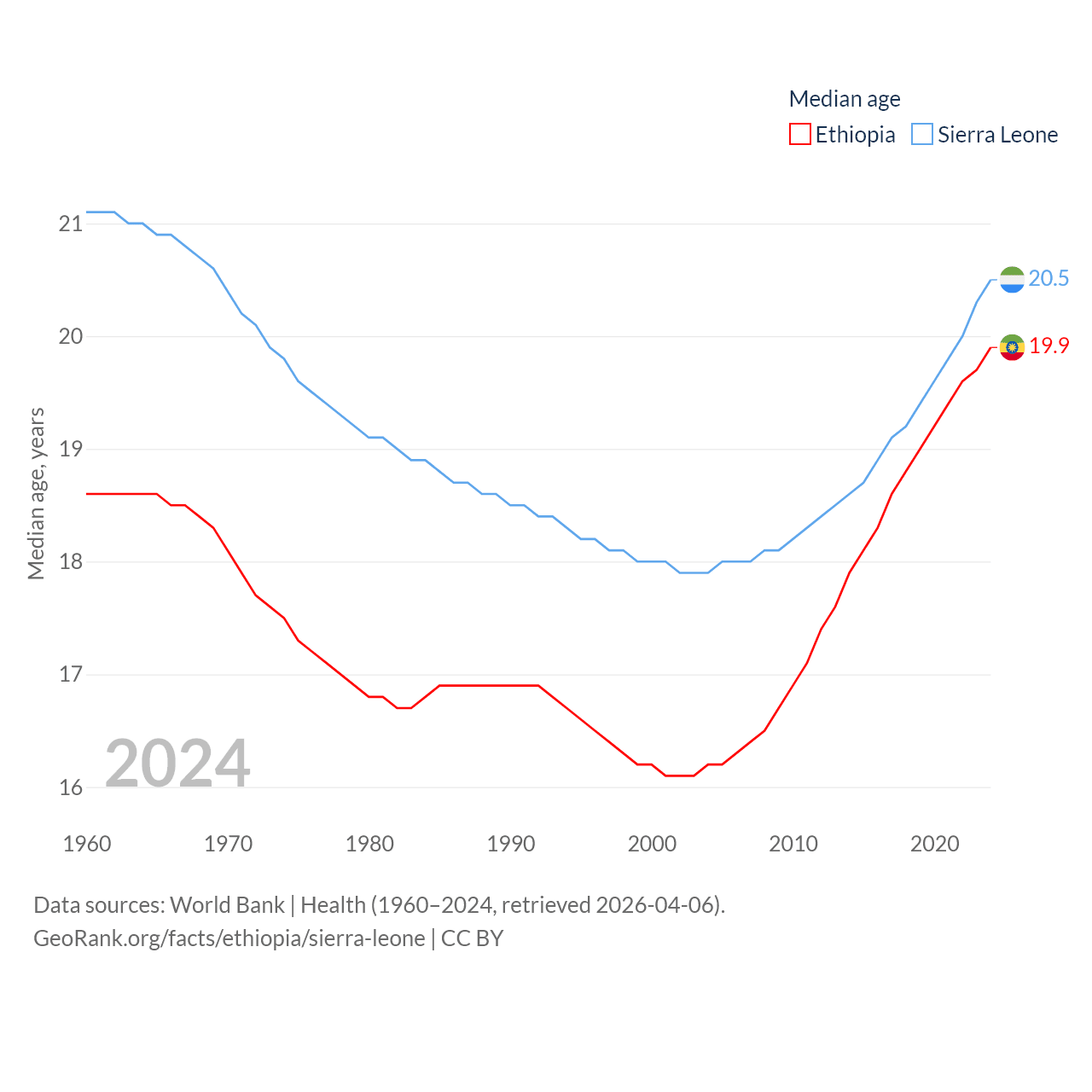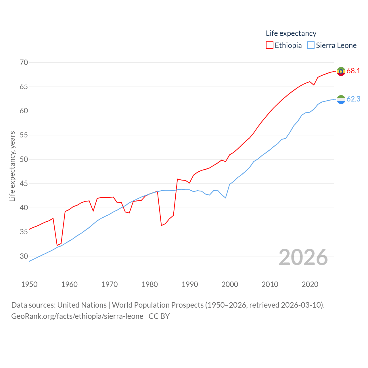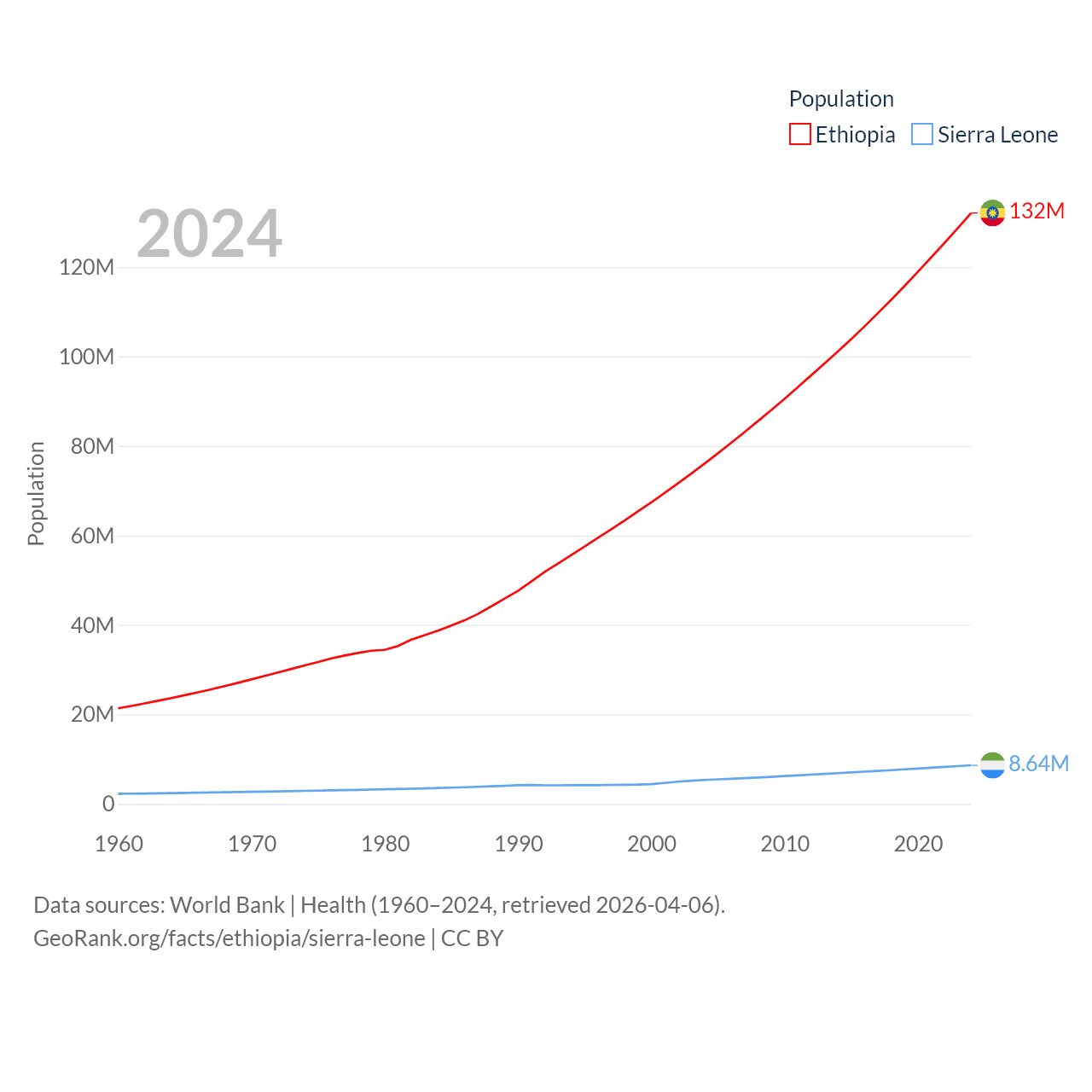 Ethiopia has a population of 132M (ranked 10/197), compared with 8.64M in Sierra Leone (ranked 102/197). Ethiopia's land area is 435,716 sq mi versus 27,869 sq mi for Sierra Leone (ranked 25th vs. 116th).