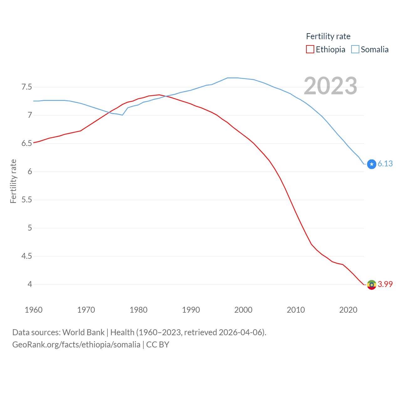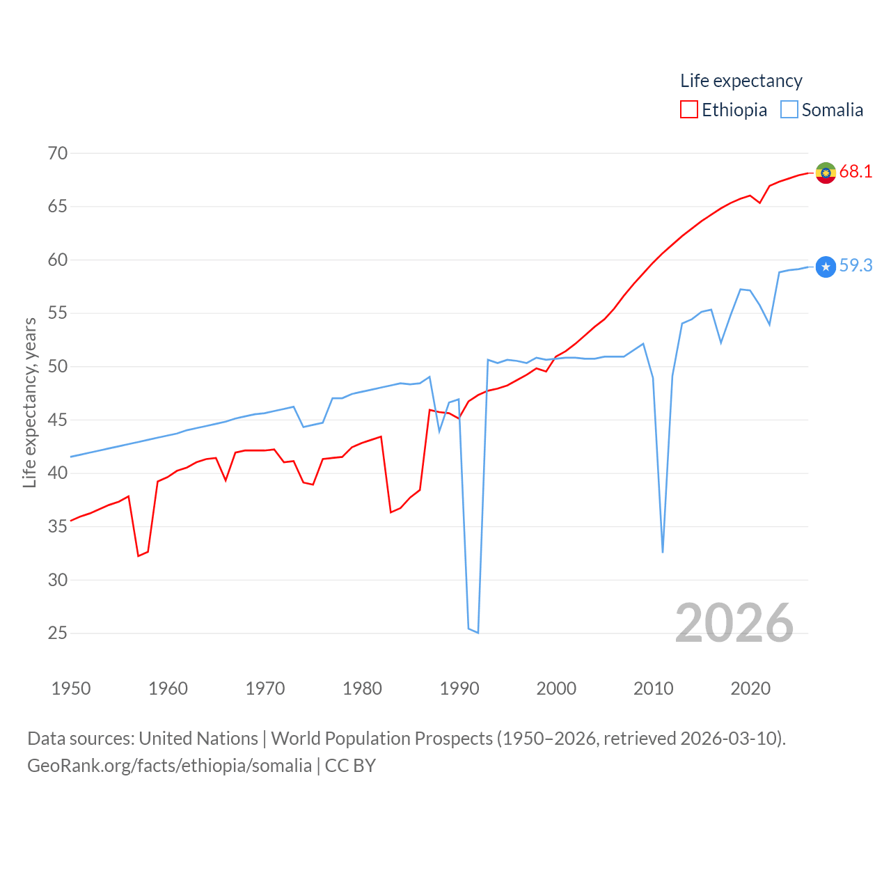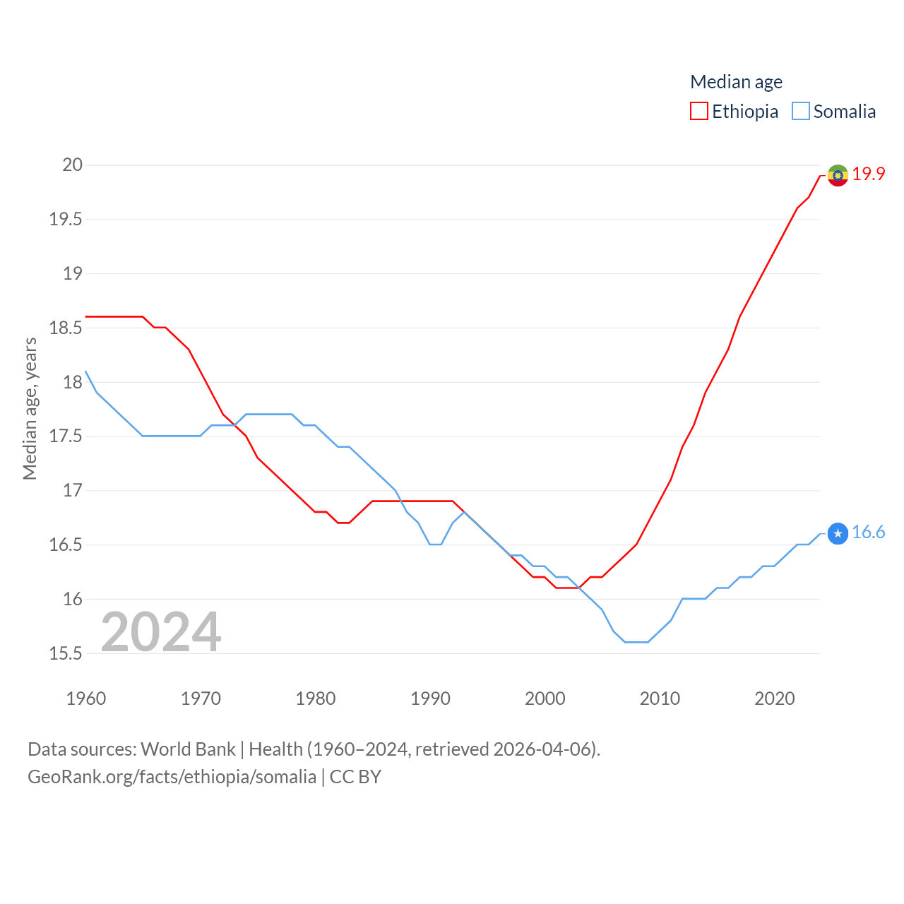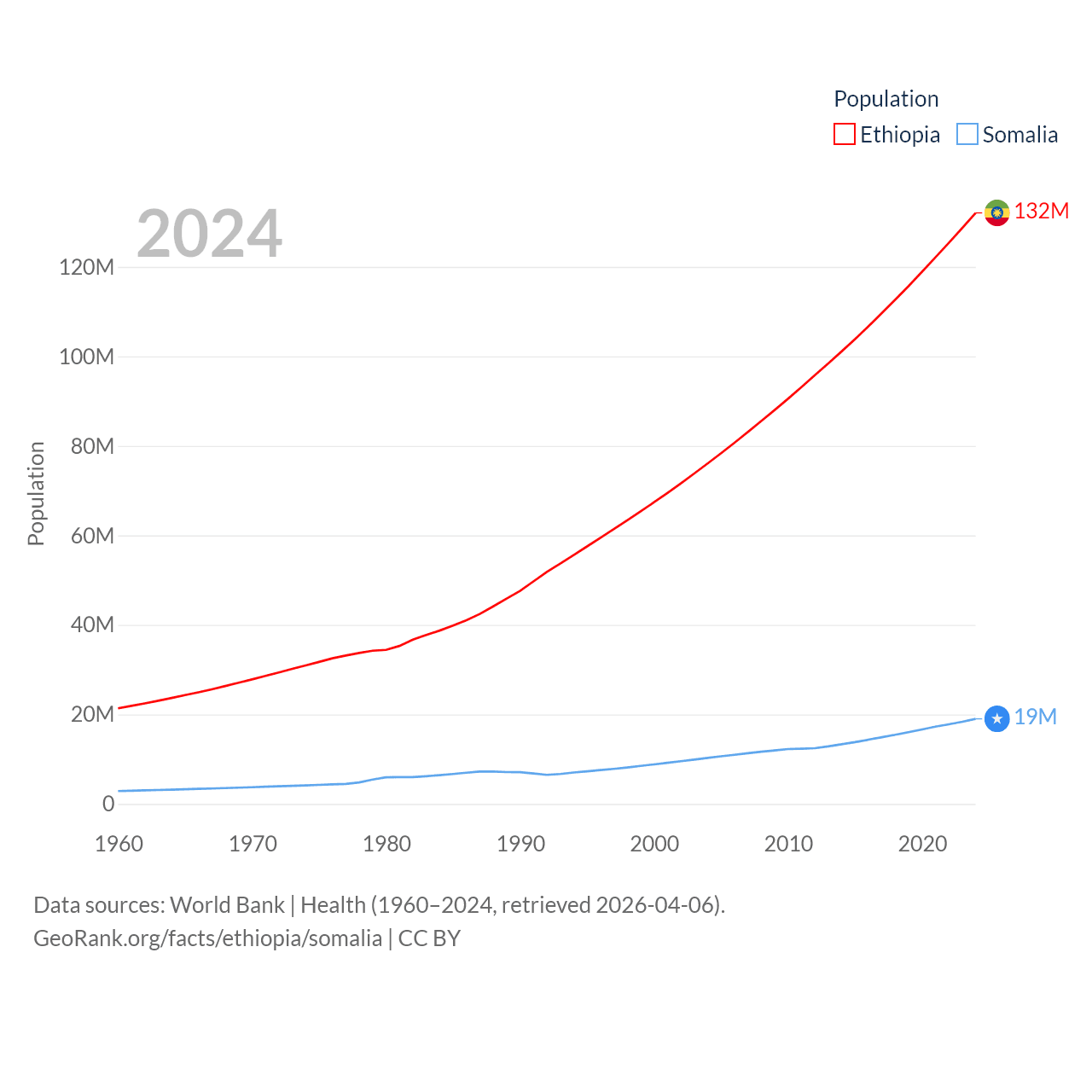 Ethiopia has a population of 132M (ranked 10/197), compared with 19M in Somalia (ranked 68/197). Ethiopia's land area is 435,716 sq mi versus 242,217 sq mi for Somalia (ranked 25th vs. 42nd).