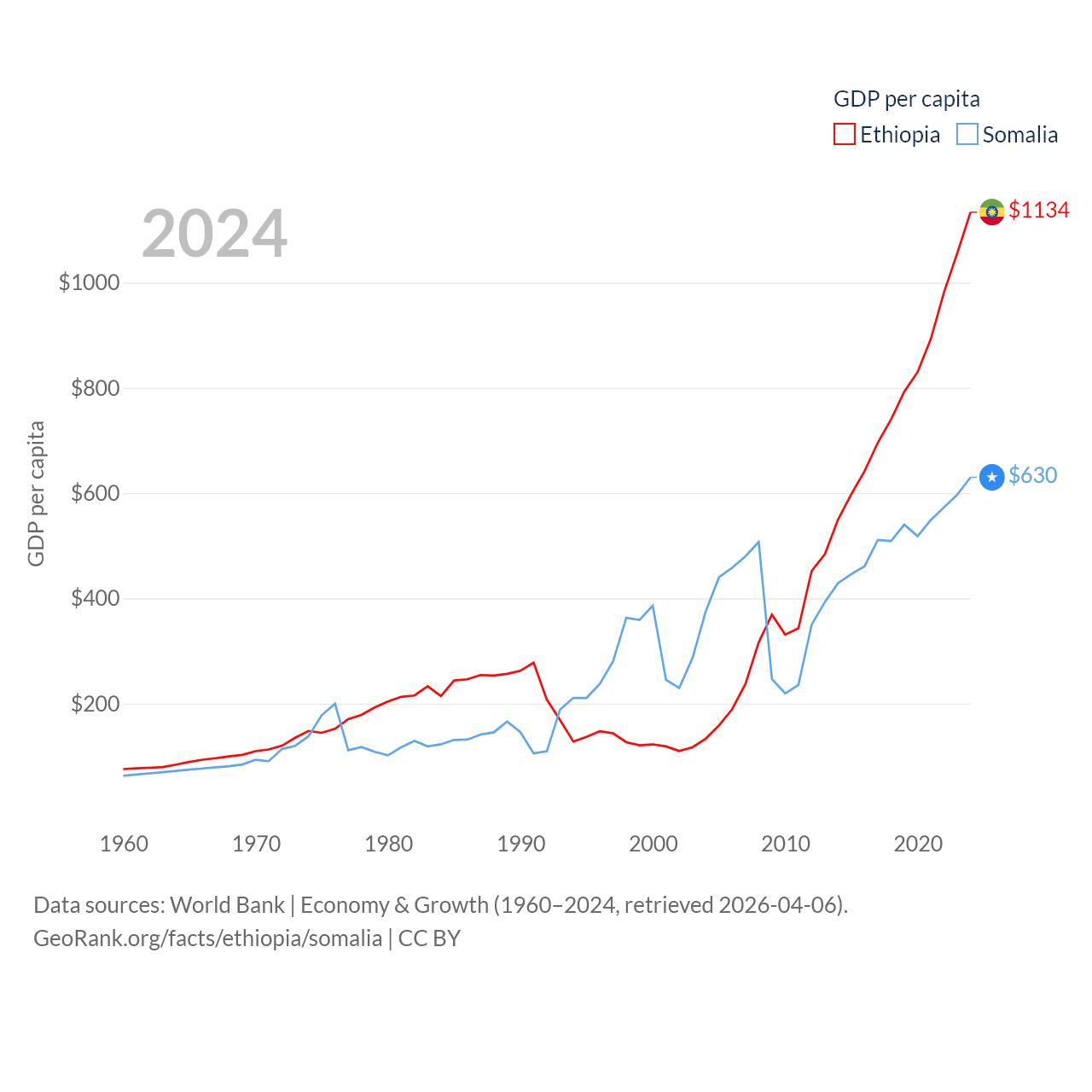 By GDP, Ethiopia ranks 60/197 ($150B) and Somalia ranks 150/197 ($12B). By GDP per capita, Ethiopia ranks 171/197 ($1,134), while Somalia ranks 192/197 ($630).
