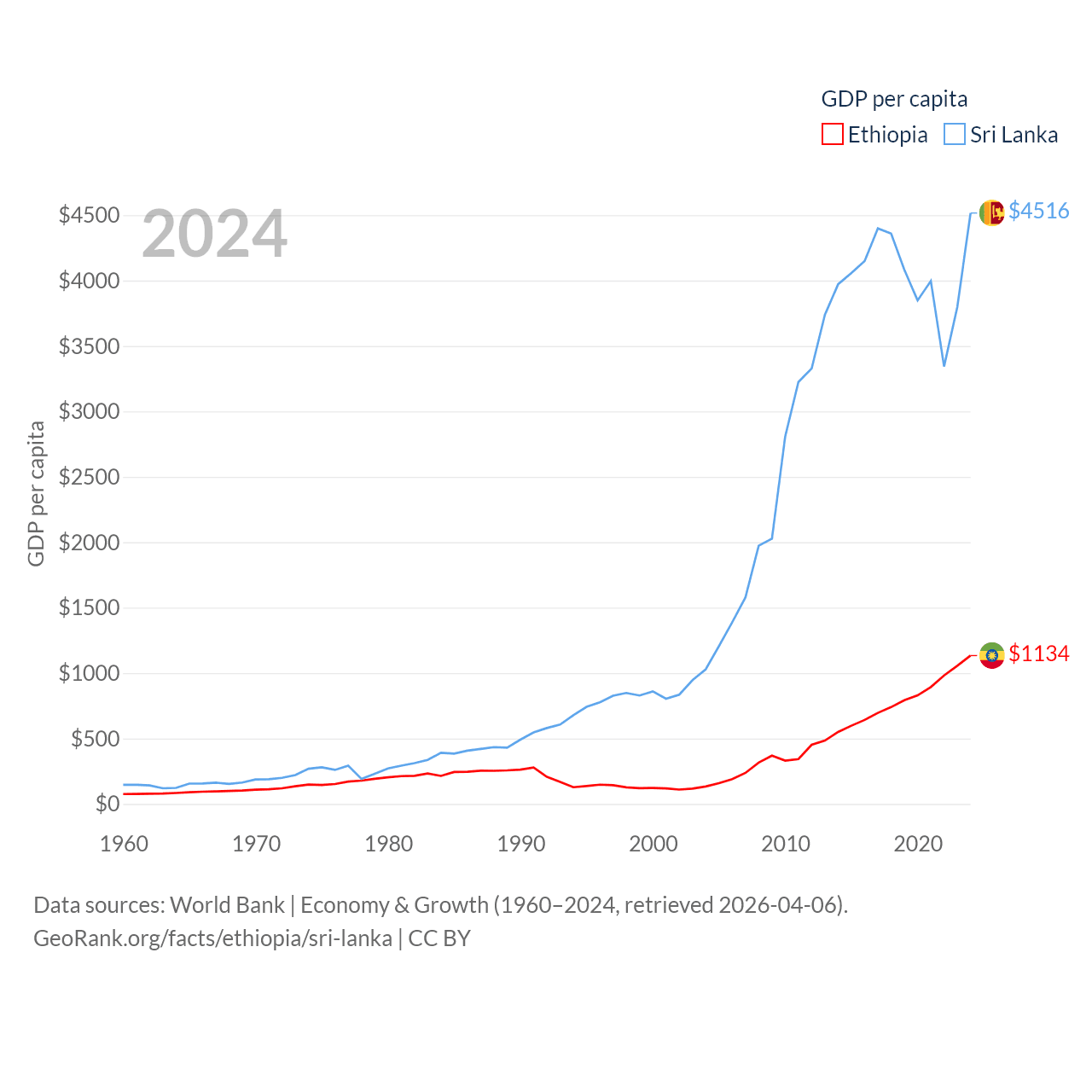 By GDP, Ethiopia ranks 60/197 ($150B) and Sri Lanka ranks 72/197 ($99B). By GDP per capita, Ethiopia ranks 171/197 ($1,134), while Sri Lanka ranks 124/197 ($4,516).