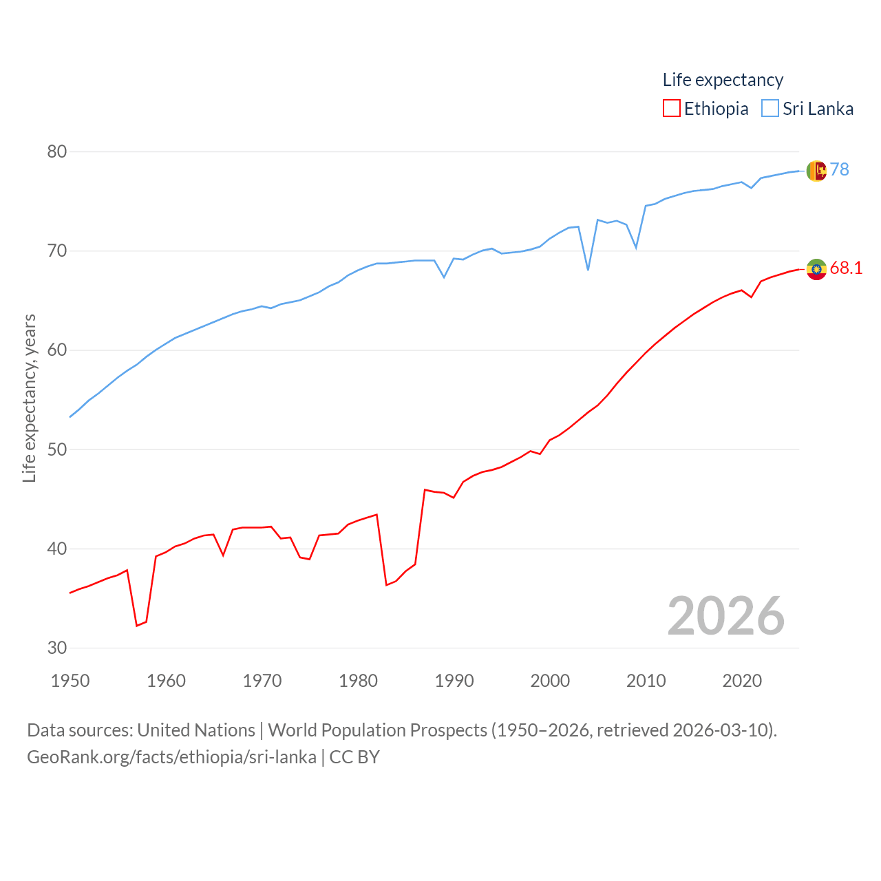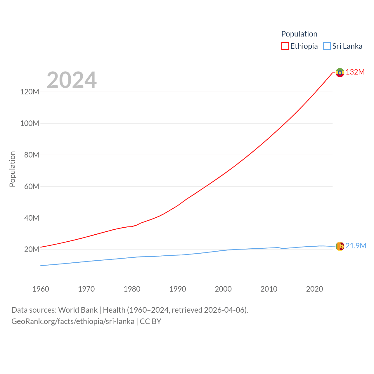 Ethiopia has a population of 132M (ranked 10/197), compared with 21.9M in Sri Lanka (ranked 61/197). Ethiopia's land area is 435,716 sq mi versus 23,884 sq mi for Sri Lanka (ranked 25th vs. 122nd).