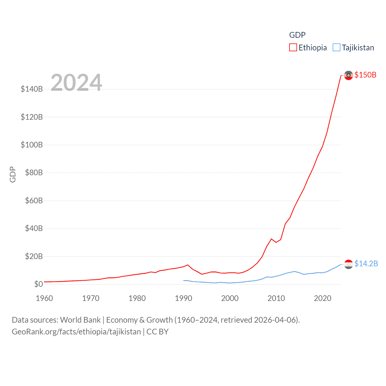 By GDP, Ethiopia ranks 60/197 ($150B) and Tajikistan ranks 145/197 ($14.2B). By GDP per capita, Ethiopia ranks 171/197 ($1,134), while Tajikistan ranks 166/197 ($1,341).