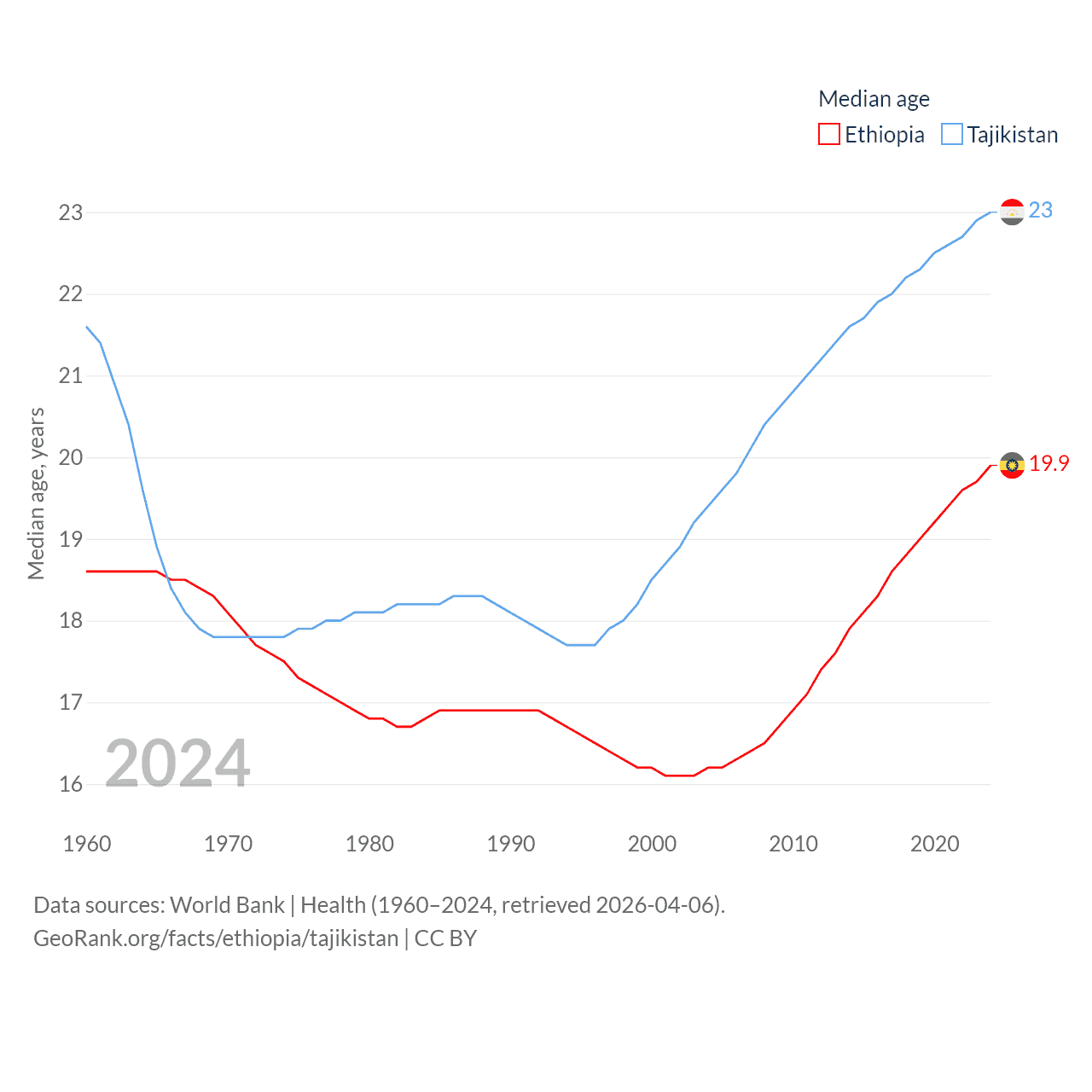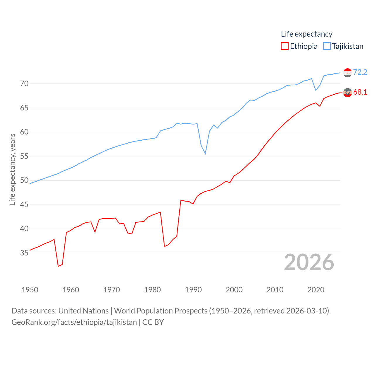 Ethiopia has a population of 132M (ranked 10/197), compared with 10.6M in Tajikistan (ranked 91/197). Ethiopia's land area is 435,716 sq mi versus 53,587 sq mi for Tajikistan (ranked 25th vs. 93rd).