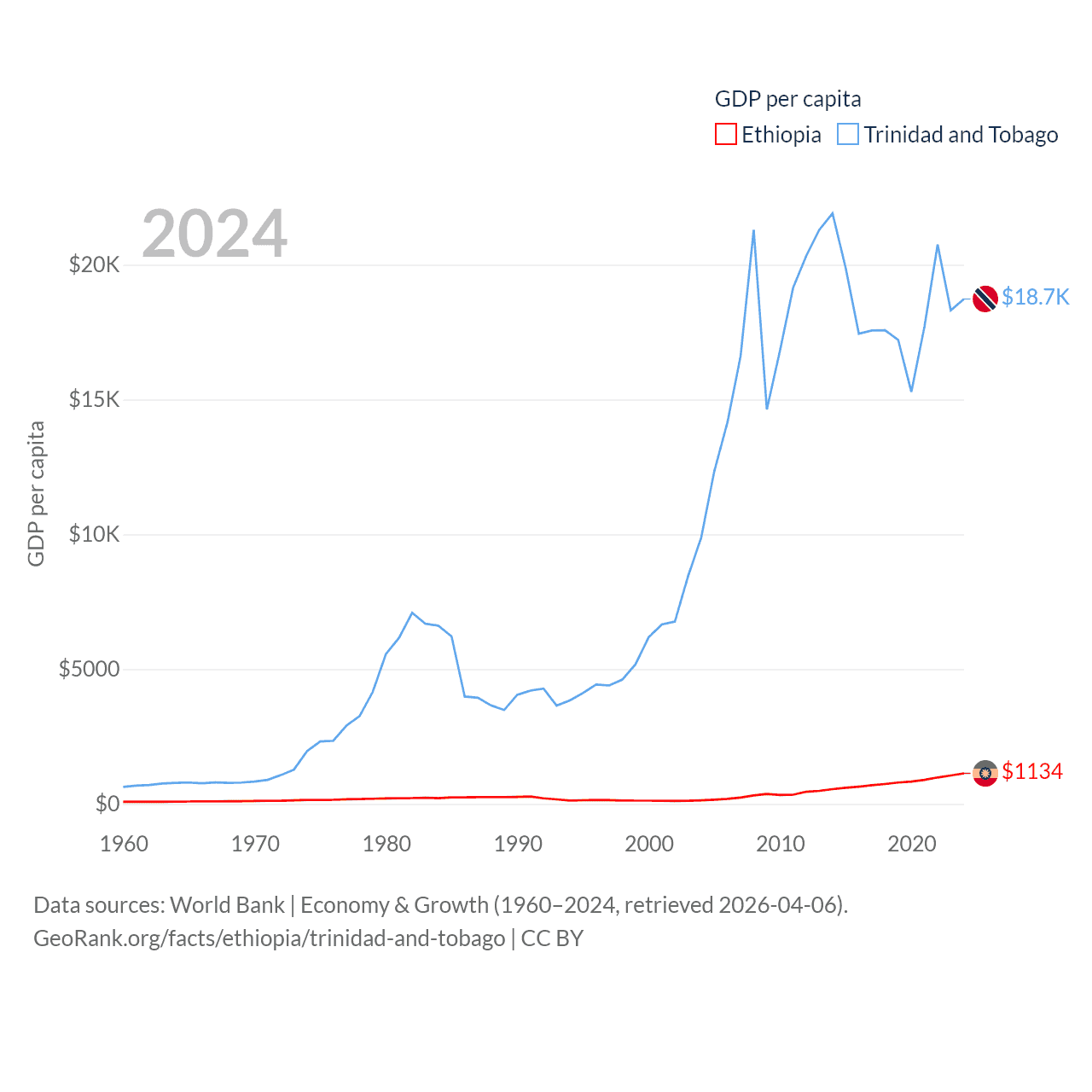 By GDP, Ethiopia ranks 60/197 ($150B) and Trinidad and Tobago ranks 115/197 ($25.6B). By GDP per capita, Ethiopia ranks 171/197 ($1,134), while Trinidad and Tobago ranks 61/197 ($18,733).