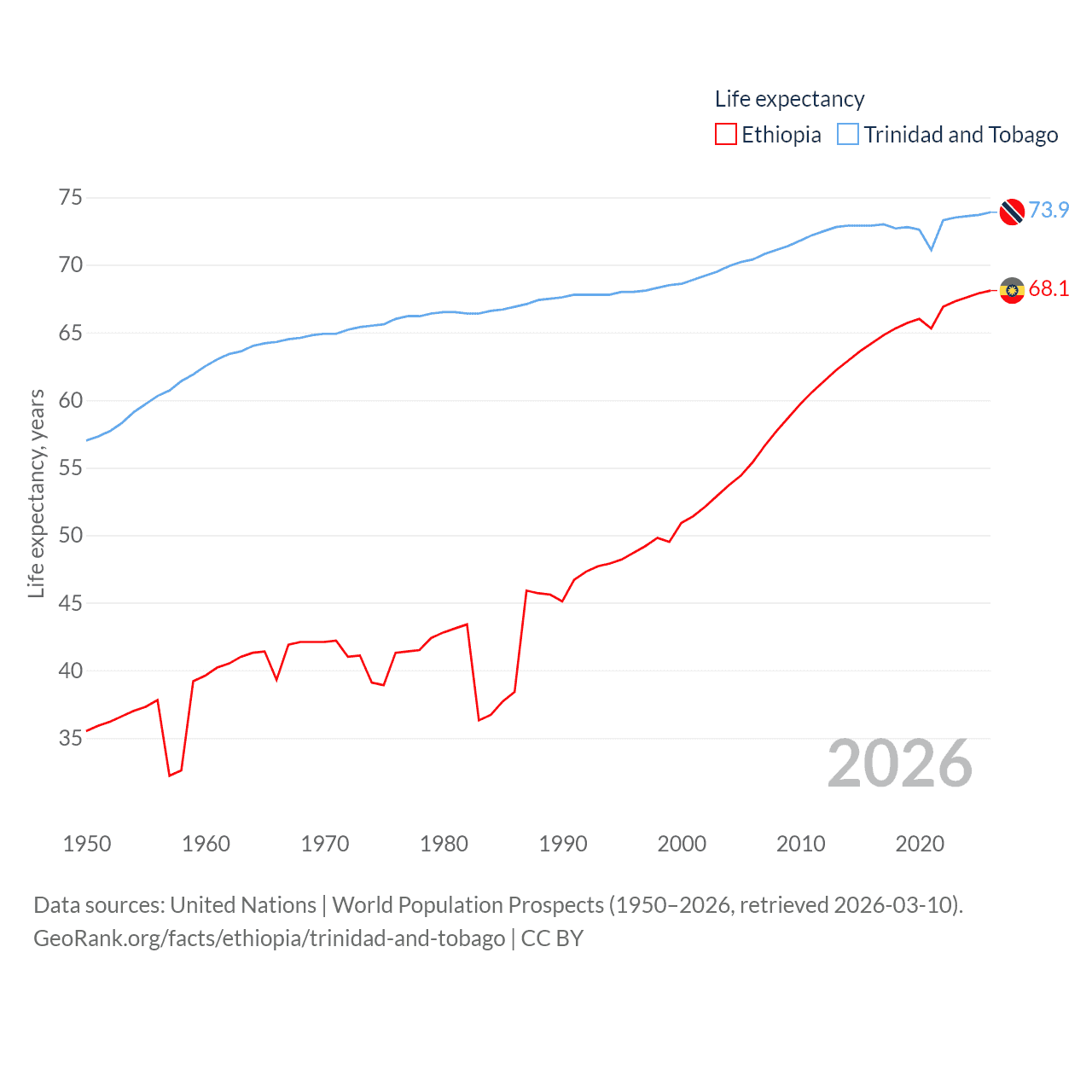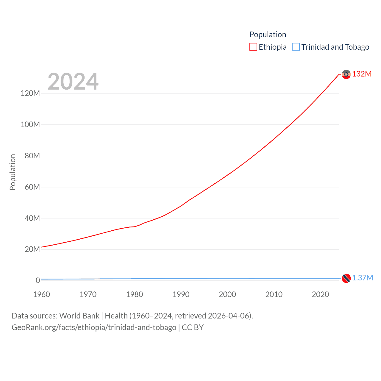 Ethiopia has a population of 132M (ranked 10/197), compared with 1.37M in Trinidad and Tobago (ranked 154/197). Ethiopia's land area is 435,716 sq mi versus 1,981 sq mi for Trinidad and Tobago (ranked 25th vs. 166th).