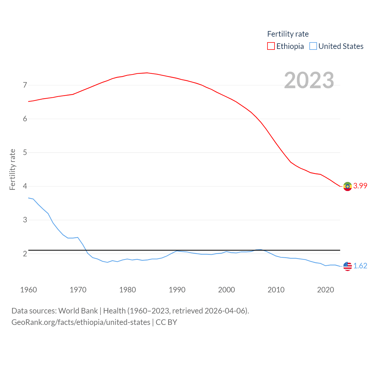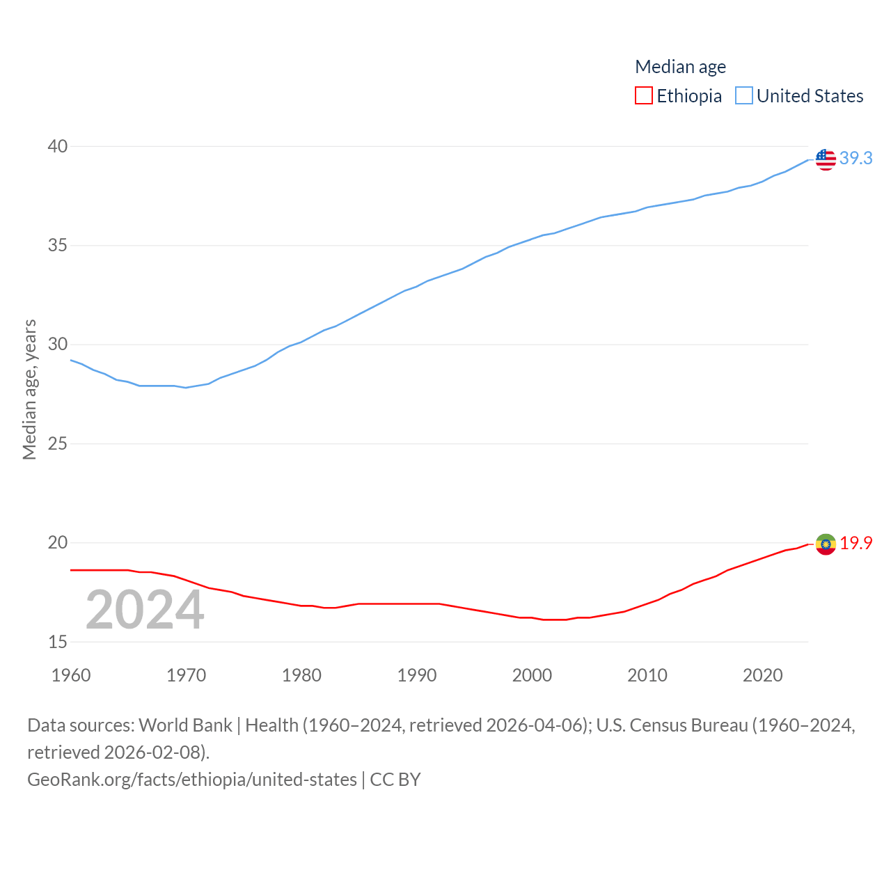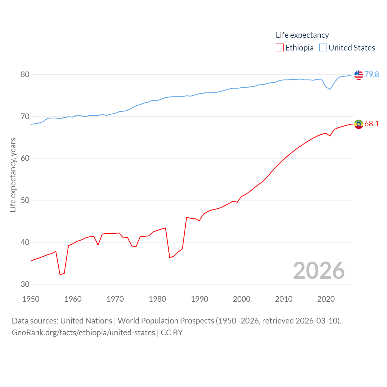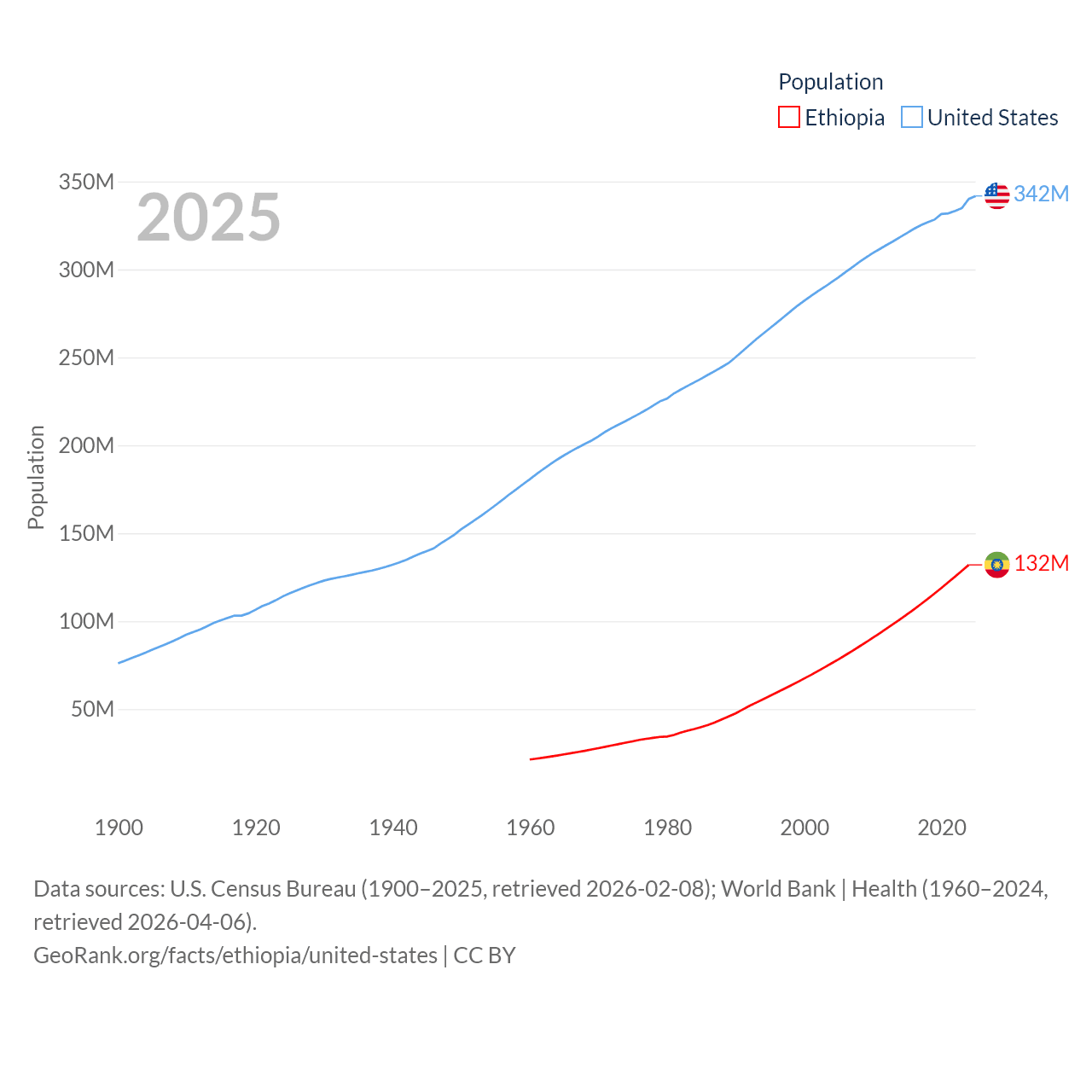 Ethiopia has a population of 132M (ranked 10/197), compared with 342M in The United States (ranked 3/197). Ethiopia's land area is 435,716 sq mi versus 3,531,839 sq mi for The United States (ranked 25th vs. 3rd).