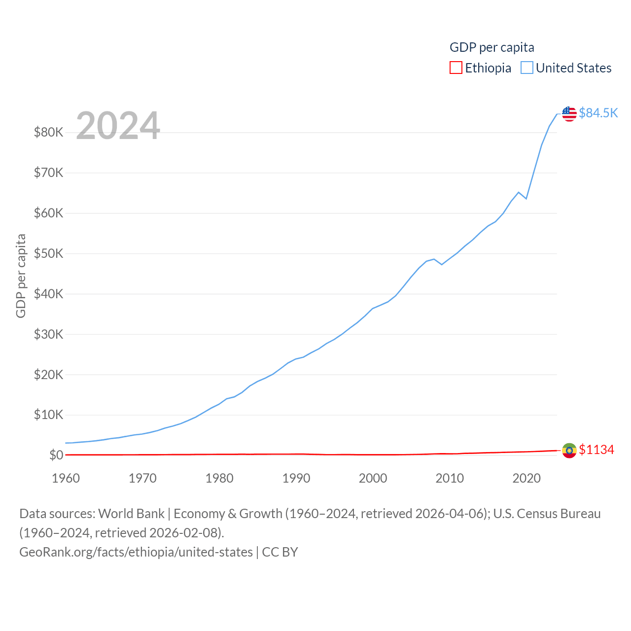 By GDP, Ethiopia ranks 60/197 ($150B) and The United States ranks 1/197 ($28.8T). By GDP per capita, Ethiopia ranks 171/197 ($1,134), while The United States ranks 10/197 ($84,534).