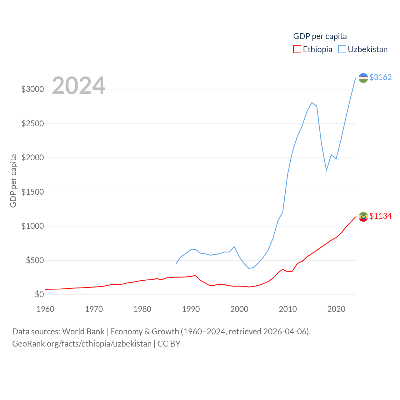 By GDP, Ethiopia ranks 60/197 ($150B) and Uzbekistan ranks 66/197 ($115B). By GDP per capita, Ethiopia ranks 171/197 ($1,134), while Uzbekistan ranks 139/197 ($3,162).