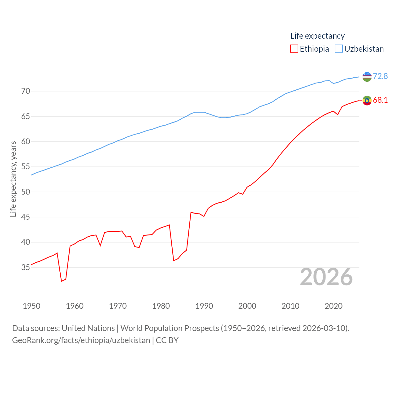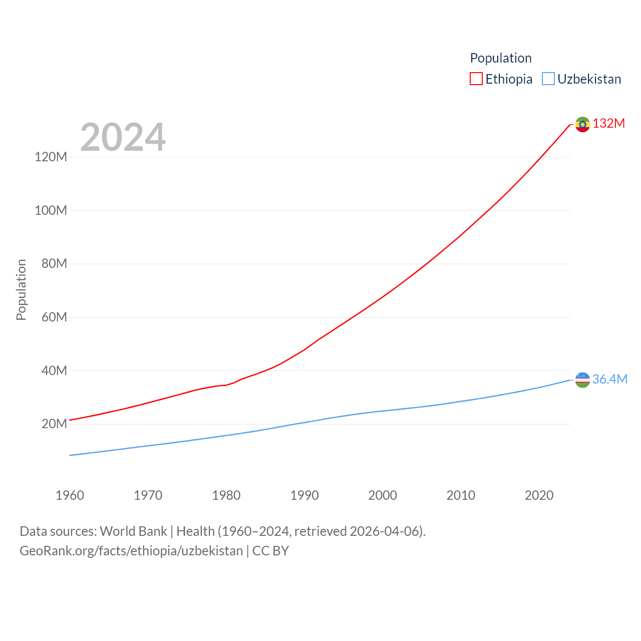 Ethiopia has a population of 132M (ranked 10/197), compared with 36.4M in Uzbekistan (ranked 43/197). Ethiopia's land area is 435,716 sq mi versus 170,136 sq mi for Uzbekistan (ranked 25th vs. 56th).