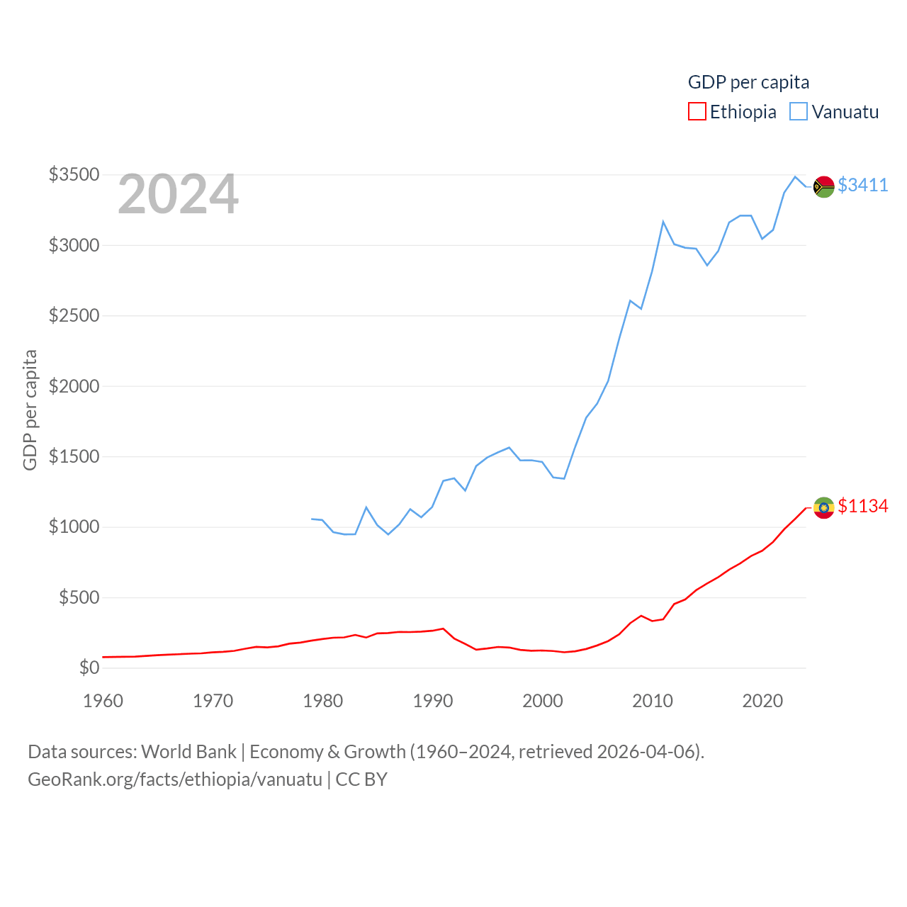 By GDP, Ethiopia ranks 60/197 ($150B) and Vanuatu ranks 188/197 ($1.12B). By GDP per capita, Ethiopia ranks 171/197 ($1,134), while Vanuatu ranks 137/197 ($3,411).
