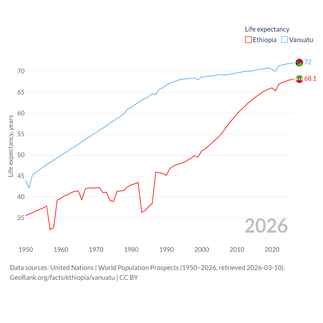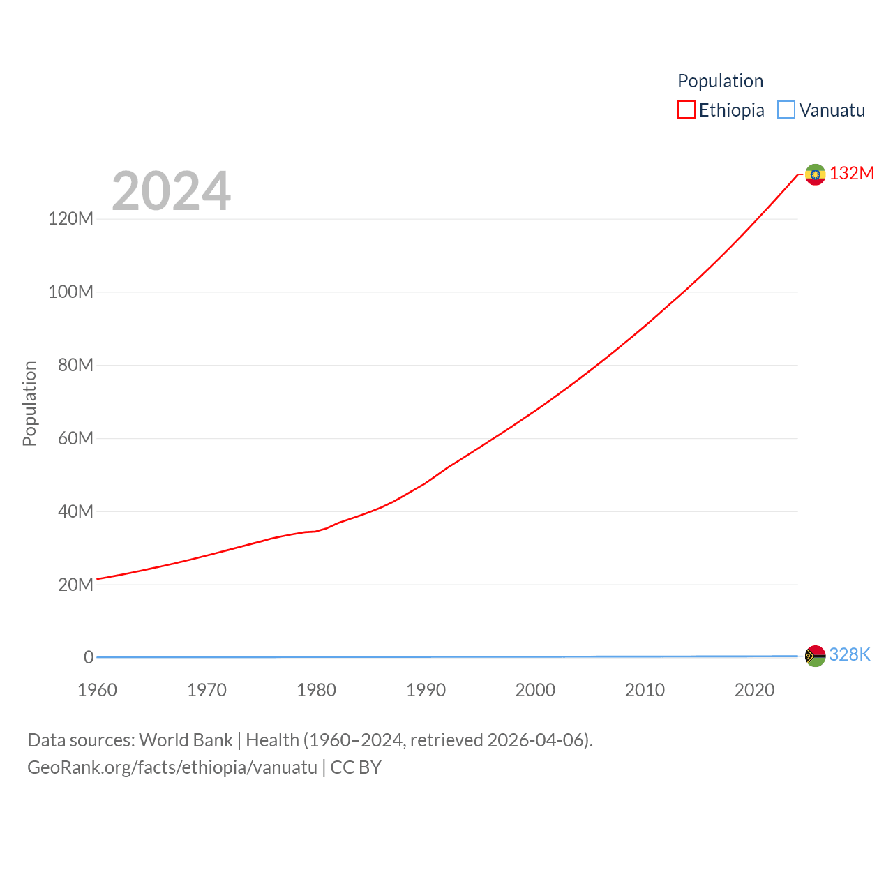 Ethiopia has a population of 132M (ranked 10/197), compared with 328K in Vanuatu (ranked 174/197). Ethiopia's land area is 435,716 sq mi versus 4,707 sq mi for Vanuatu (ranked 25th vs. 157th).