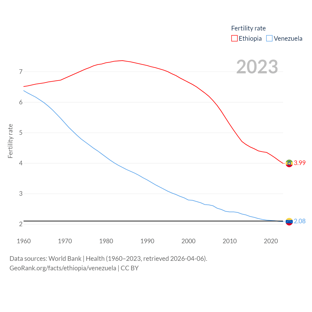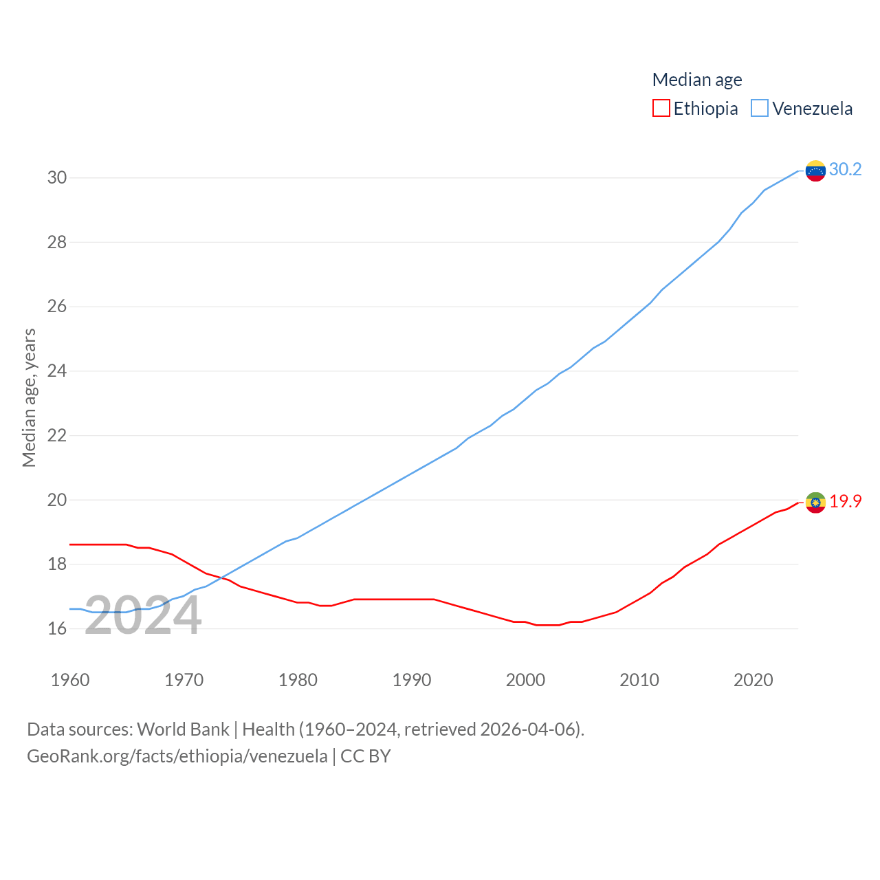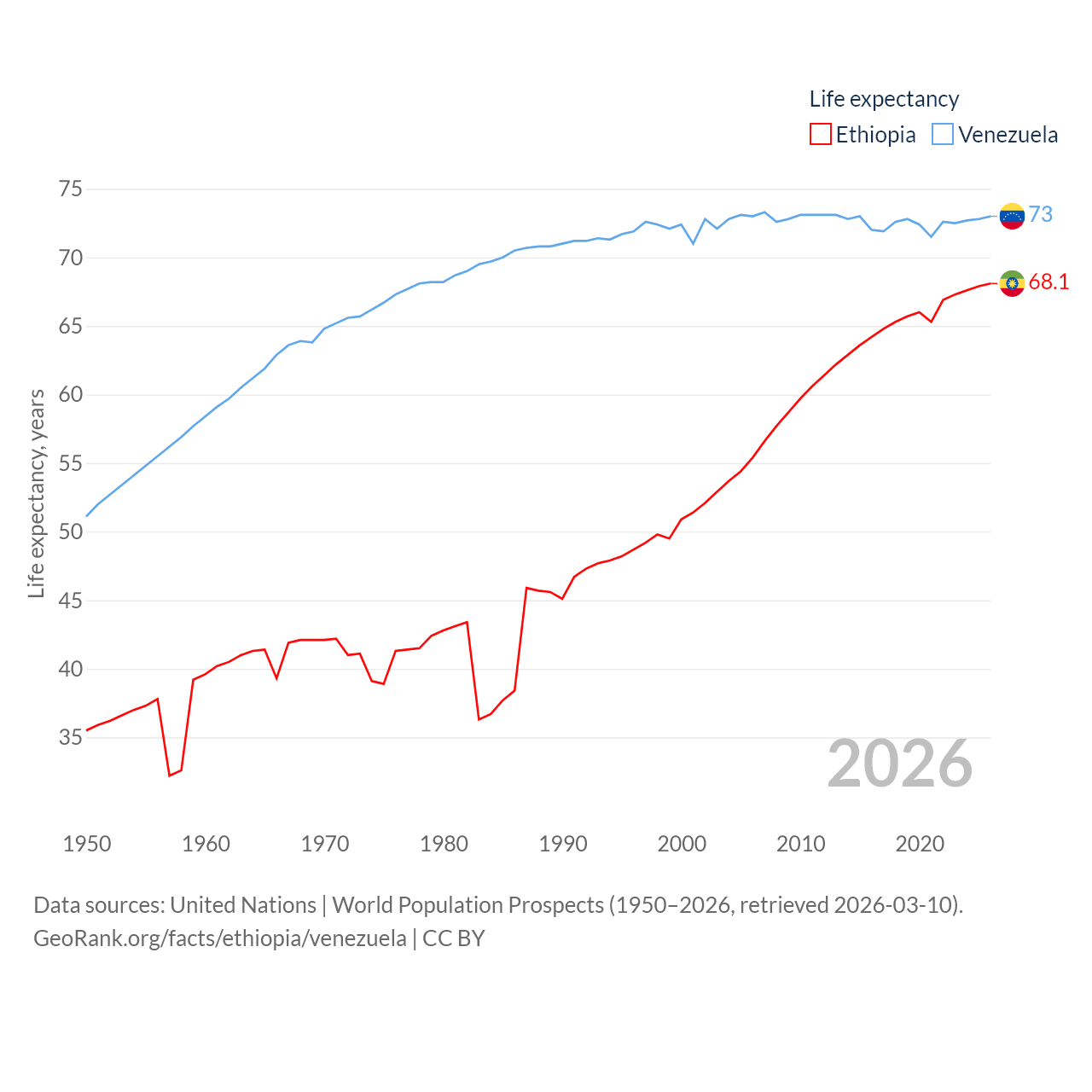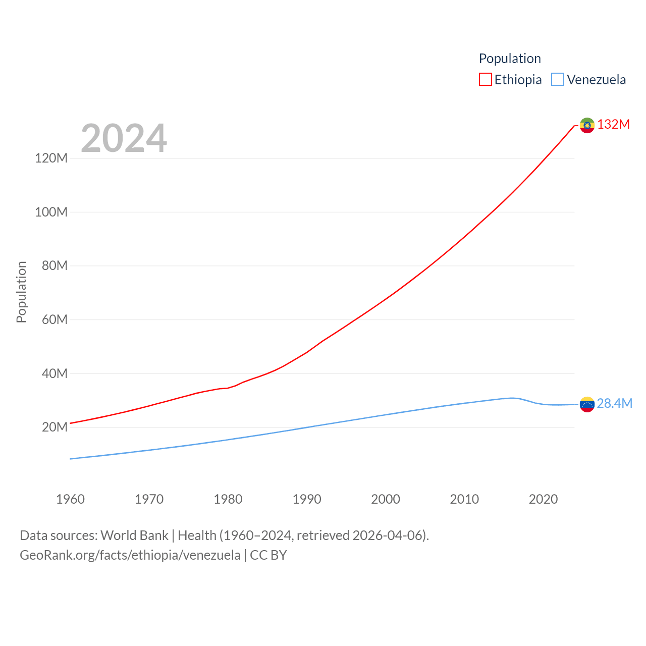 Ethiopia has a population of 132M (ranked 10/197), compared with 28.4M in Venezuela (ranked 53/197). Ethiopia's land area is 435,716 sq mi versus 340,561 sq mi for Venezuela (ranked 25th vs. 32nd).