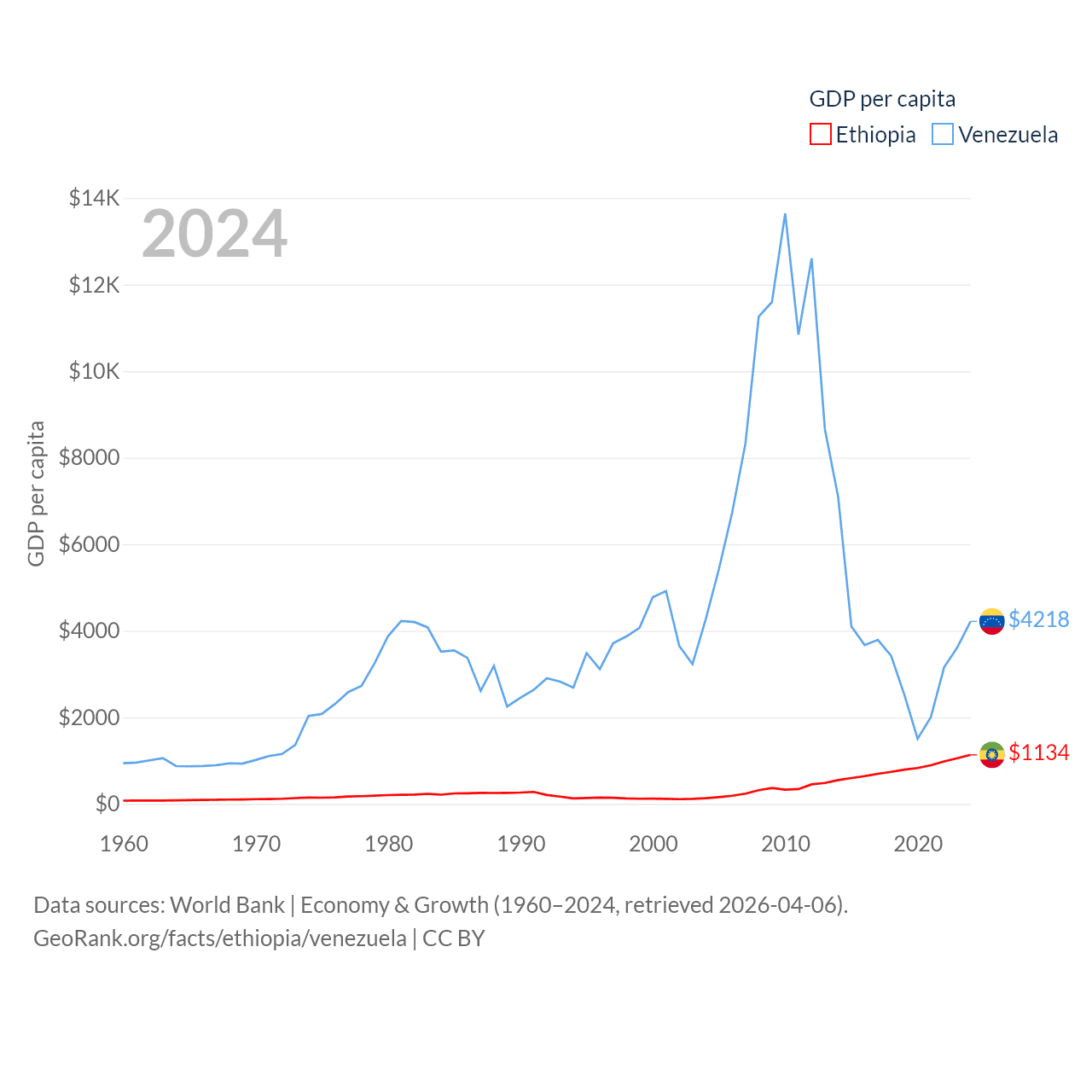 By GDP, Ethiopia ranks 60/197 ($150B) and Venezuela ranks 65/197 ($120B). By GDP per capita, Ethiopia ranks 171/197 ($1,134), while Venezuela ranks 128/197 ($4,218).