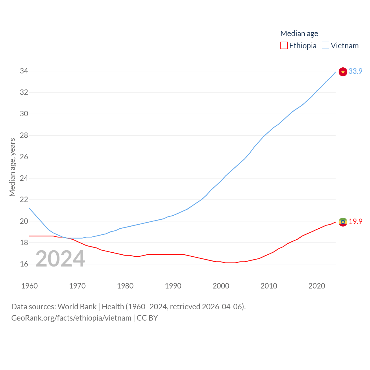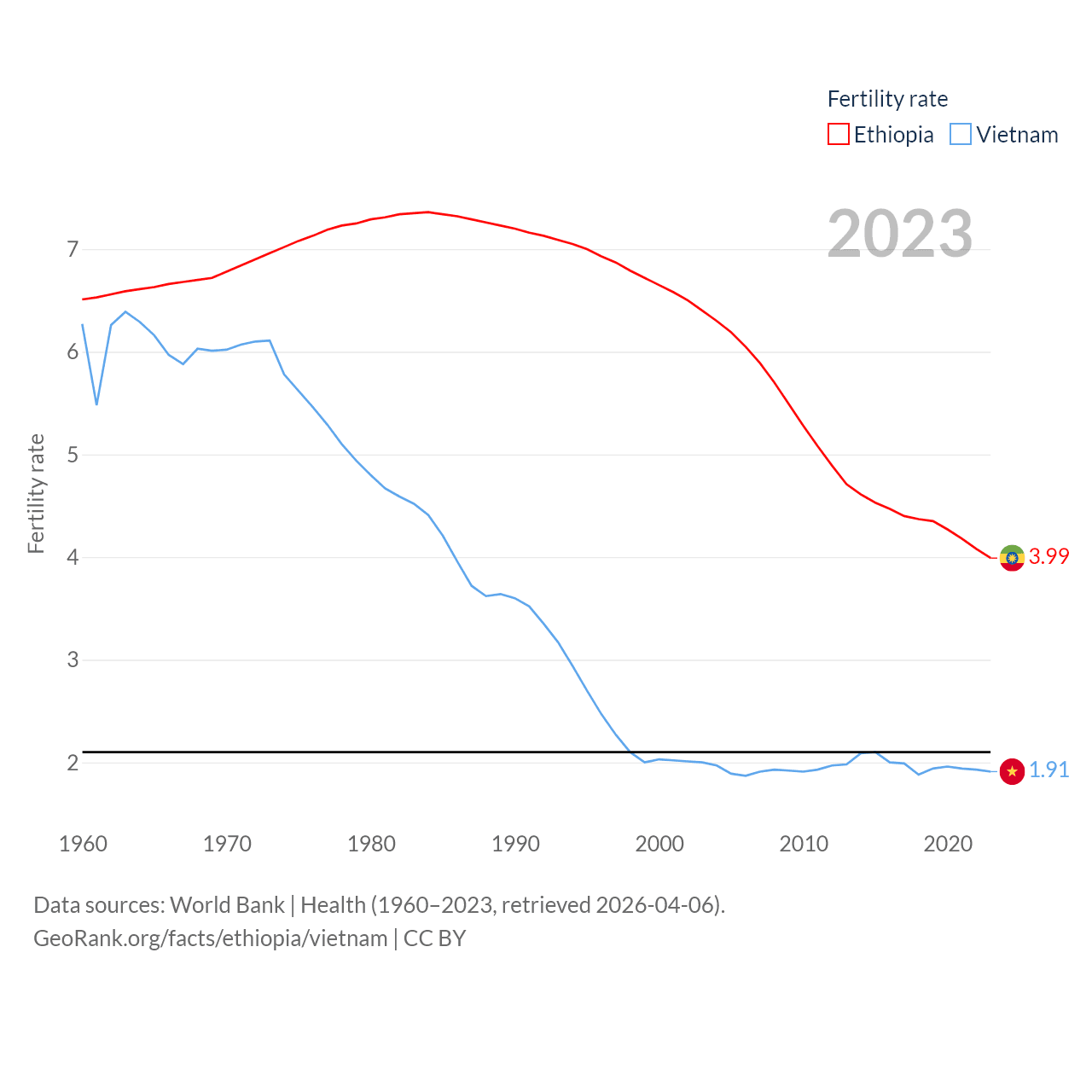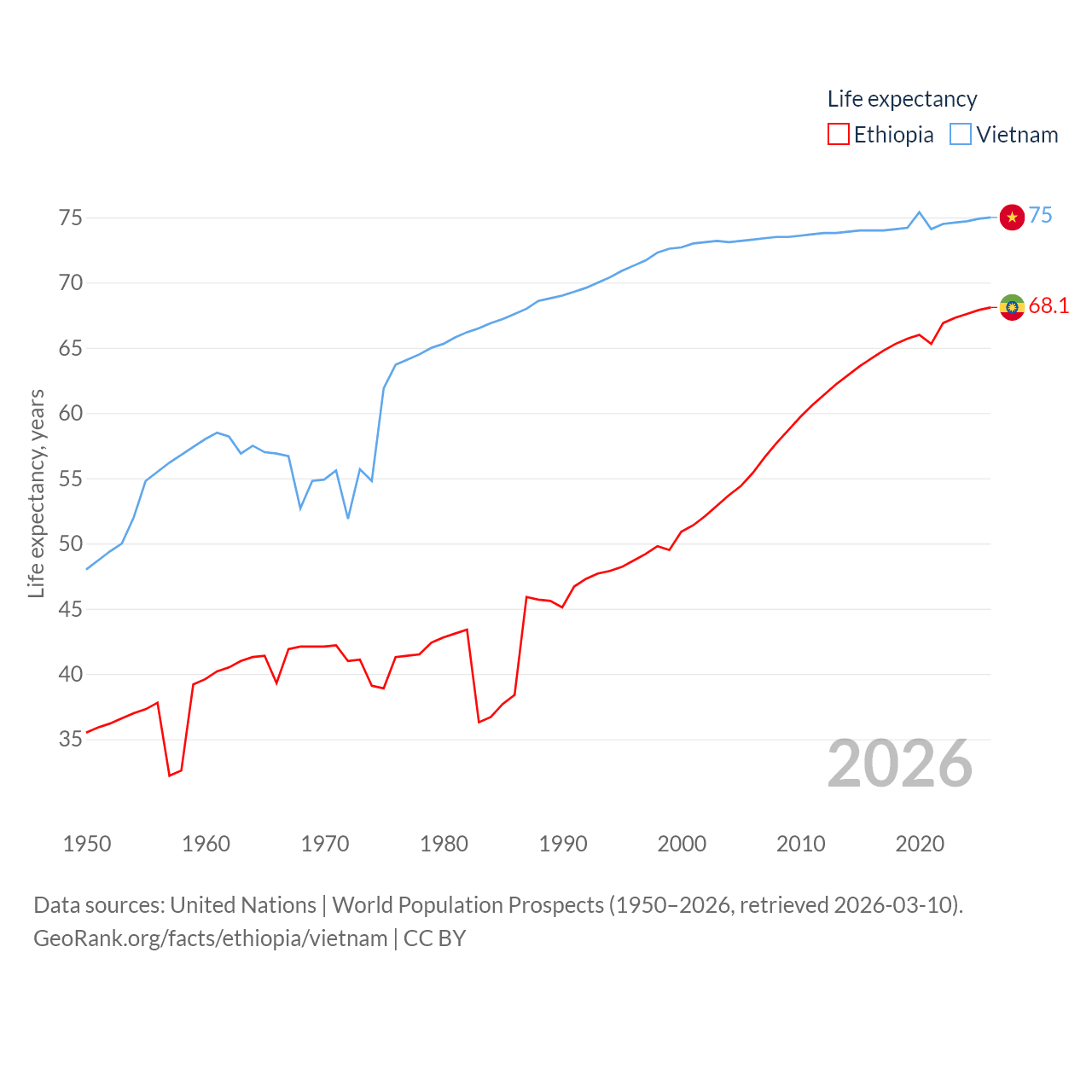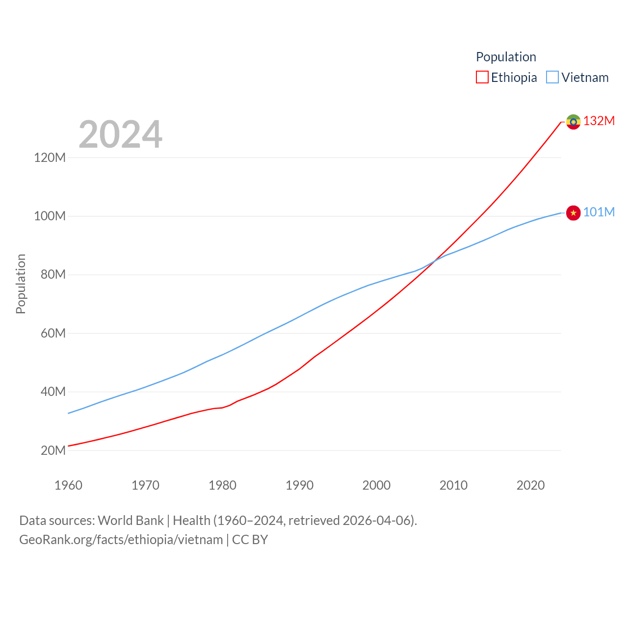 Ethiopia has a population of 132M (ranked 10/197), compared with 101M in Vietnam (ranked 16/197). Ethiopia's land area is 435,716 sq mi versus 121,016 sq mi for Vietnam (ranked 25th vs. 67th).
