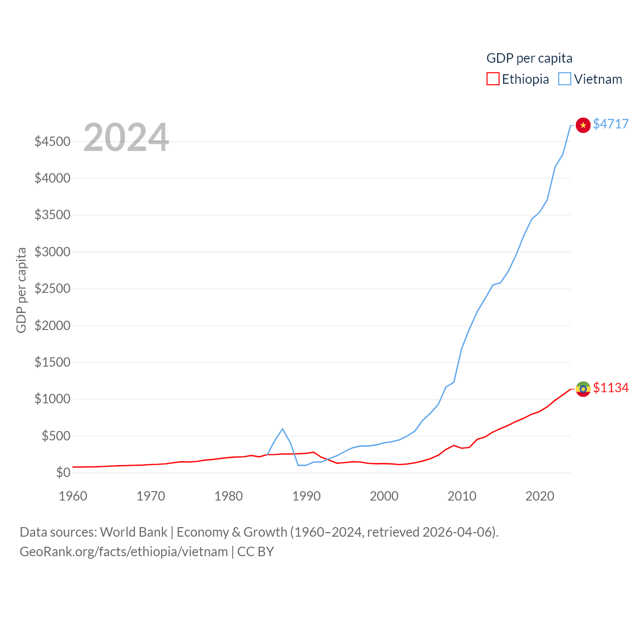By GDP, Ethiopia ranks 60/197 ($150B) and Vietnam ranks 33/197 ($476B). By GDP per capita, Ethiopia ranks 171/197 ($1,134), while Vietnam ranks 122/197 ($4,717).