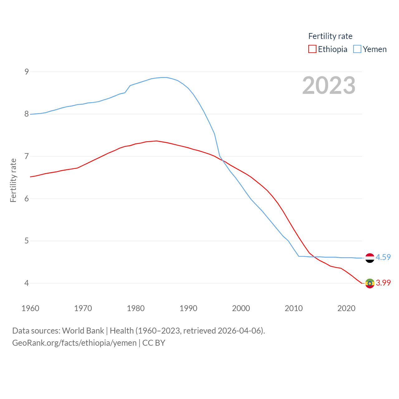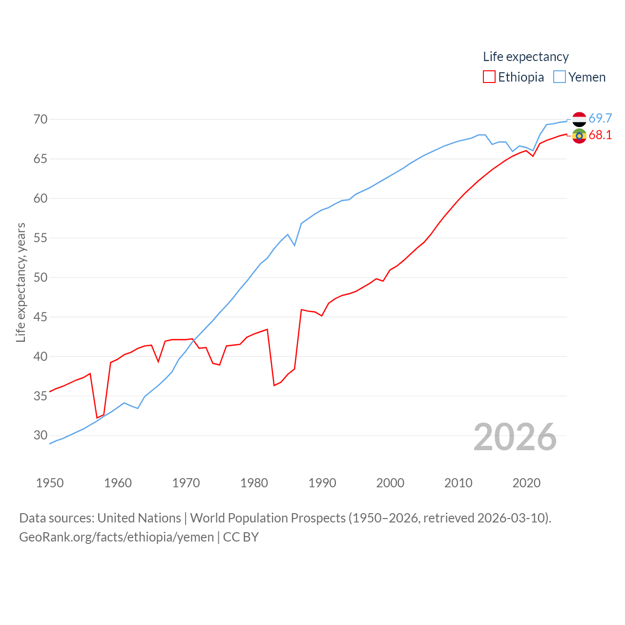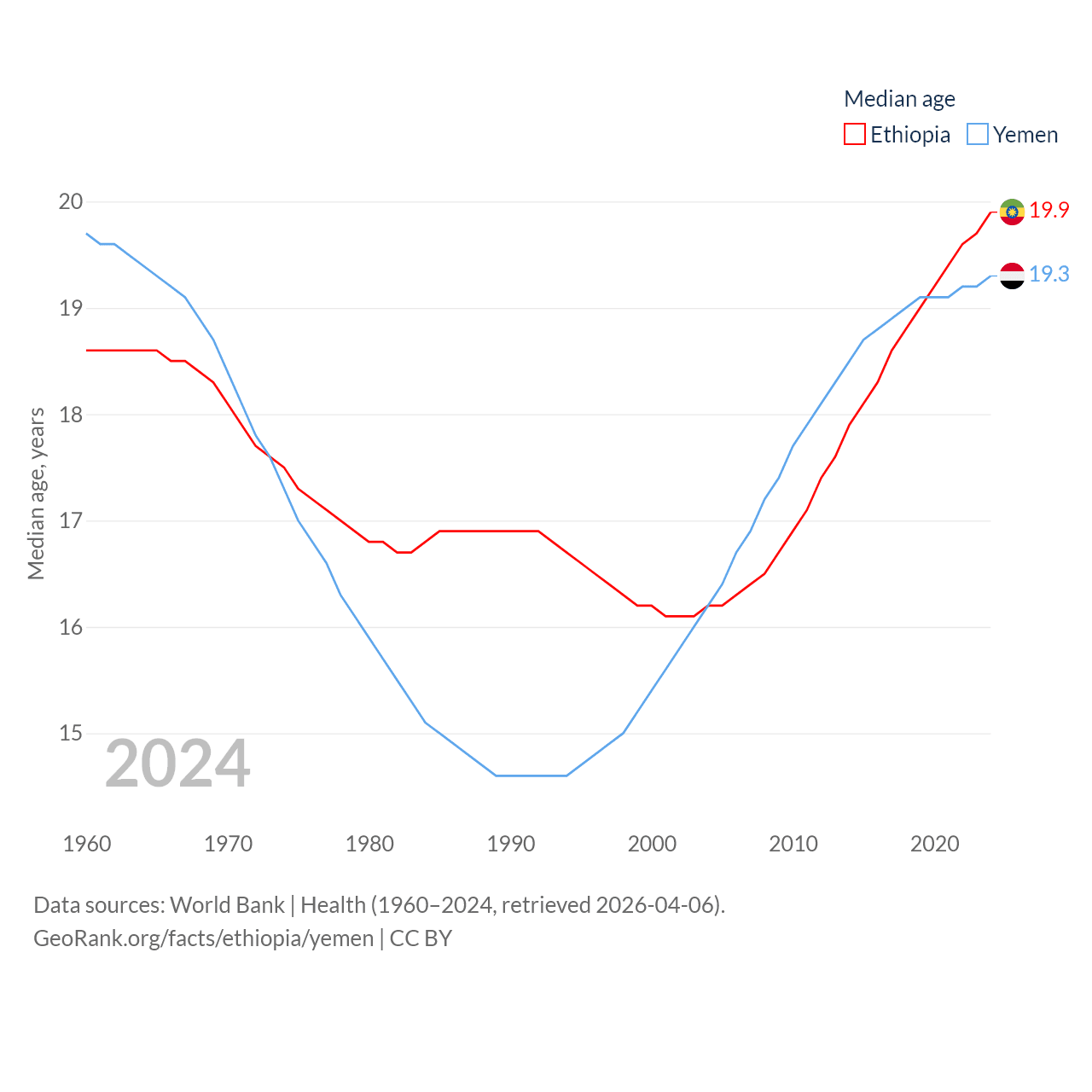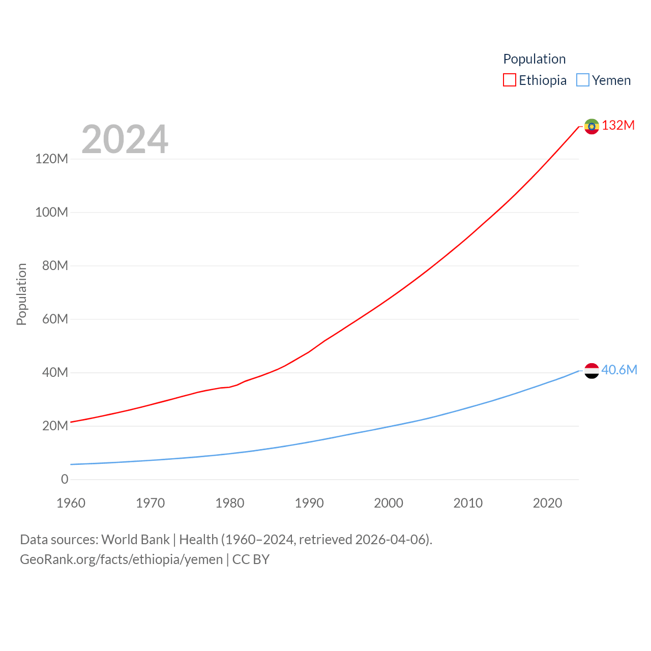 Ethiopia has a population of 132M (ranked 10/197), compared with 40.6M in Yemen (ranked 38/197). Ethiopia's land area is 435,716 sq mi versus 203,850 sq mi for Yemen (ranked 25th vs. 49th).