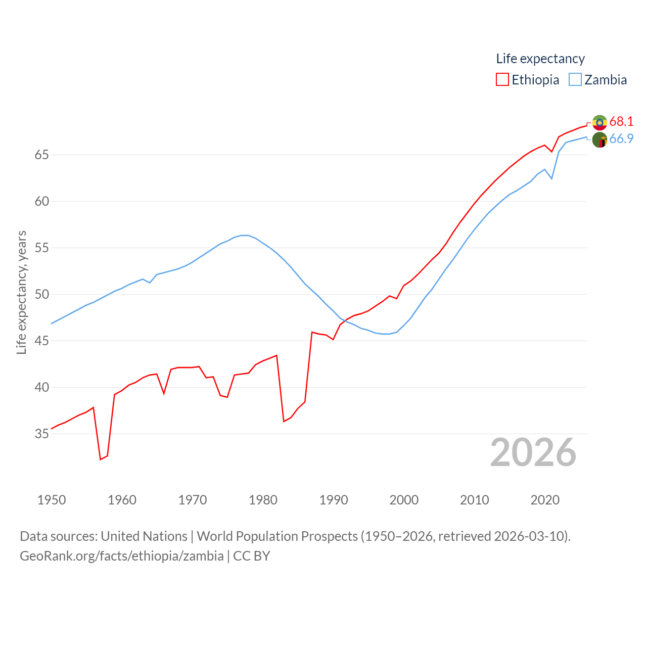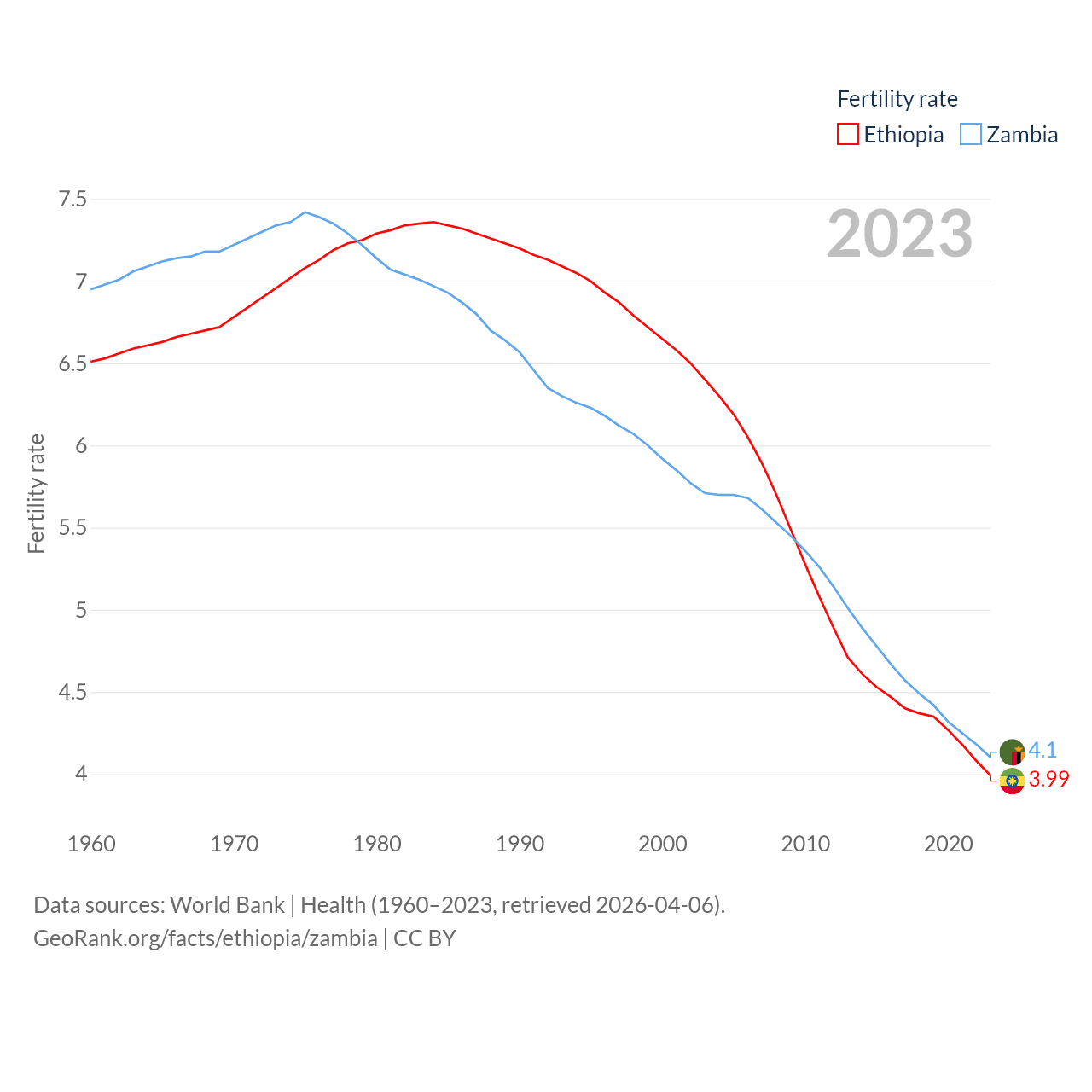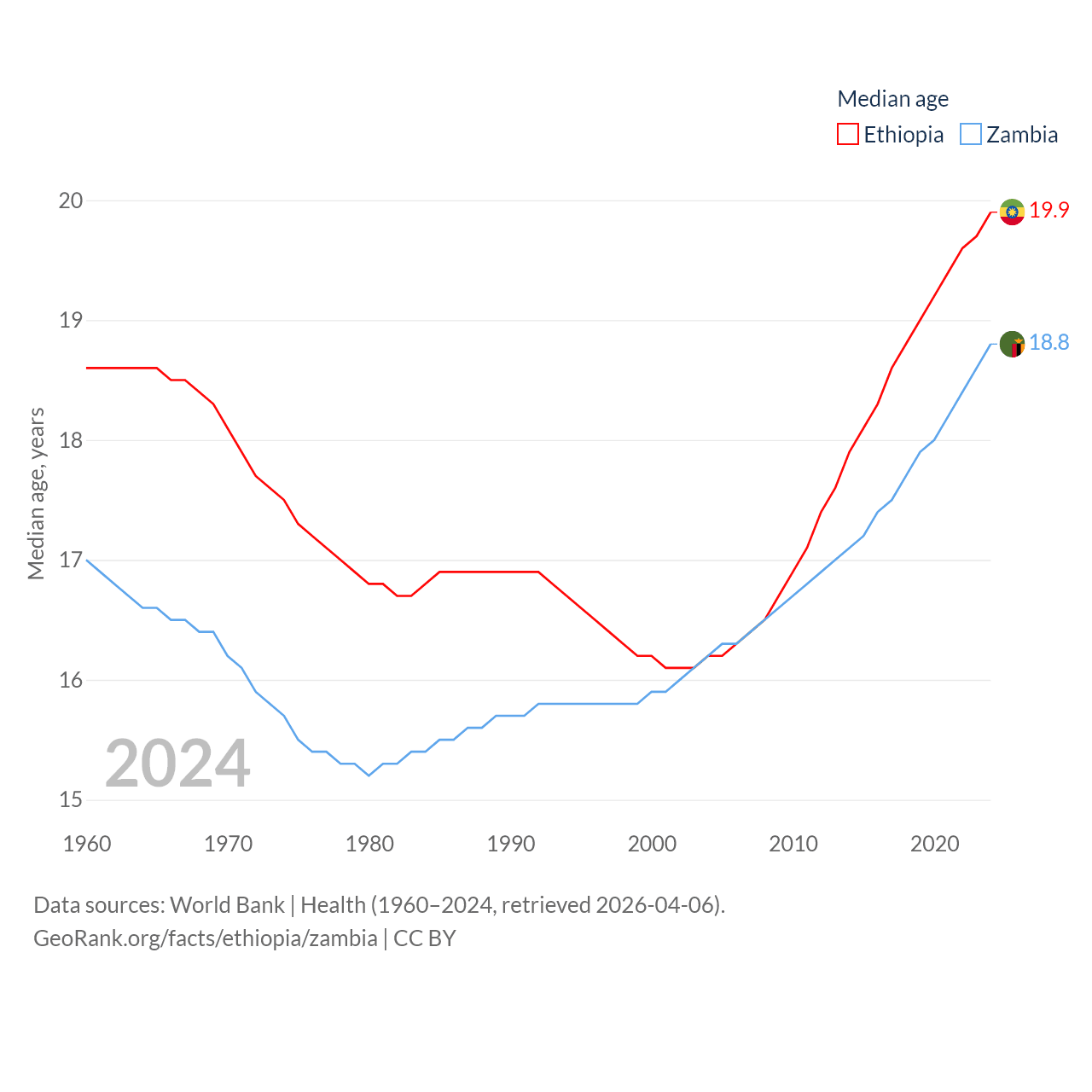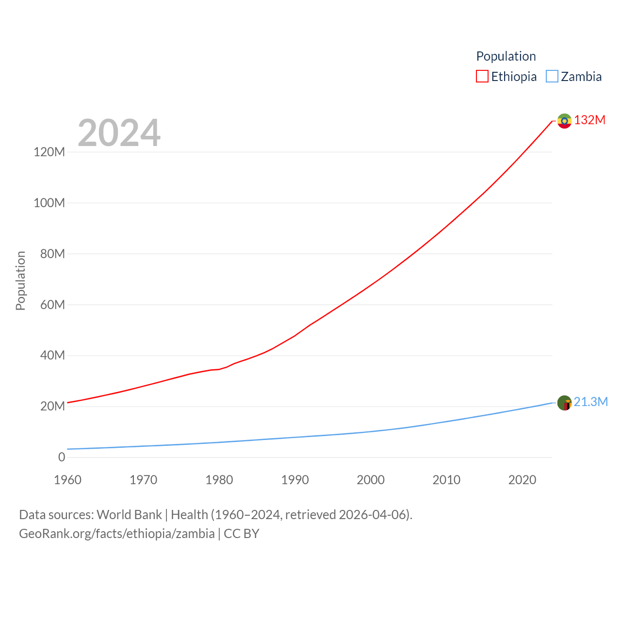 Ethiopia has a population of 132M (ranked 10/197), compared with 21.3M in Zambia (ranked 63/197). Ethiopia's land area is 435,716 sq mi versus 287,024 sq mi for Zambia (ranked 25th vs. 37th).