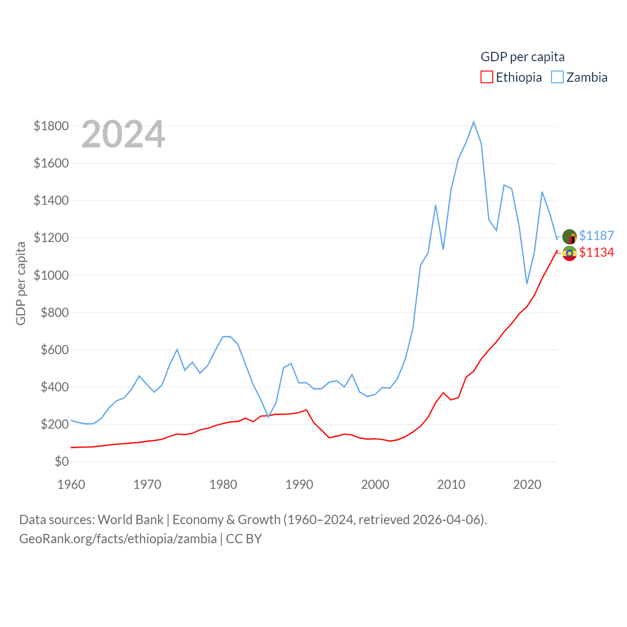 By GDP, Ethiopia ranks 60/197 ($150B) and Zambia ranks 116/197 ($25.3B). By GDP per capita, Ethiopia ranks 171/197 ($1,134), while Zambia ranks 169/197 ($1,187).