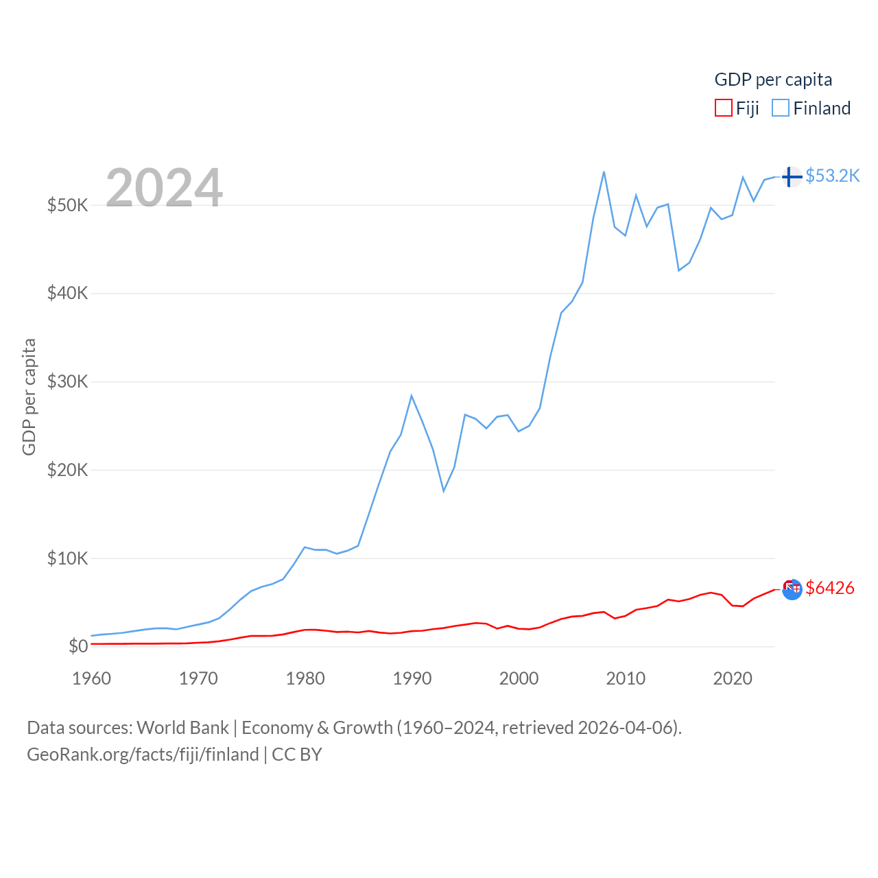 By GDP, Fiji ranks 161/197 ($5.97B) and Finland ranks 47/197 ($299B). By GDP per capita, Fiji ranks 108/197 ($6,426), while Finland ranks 23/197 ($53,150).