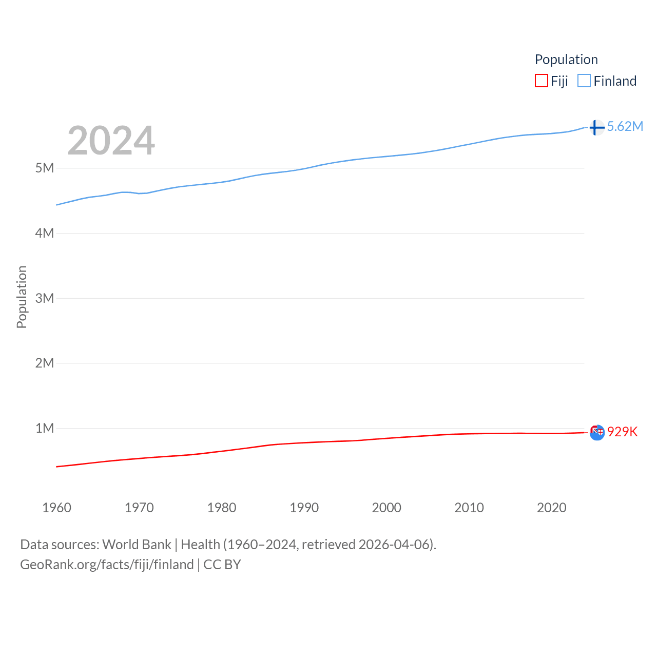Fiji has a population of 929K (ranked 159/197), compared with 5.62M in Finland (ranked 116/197). Fiji's land area is 7,054 sq mi versus 117,360 sq mi for Finland (ranked 152nd vs. 70th).