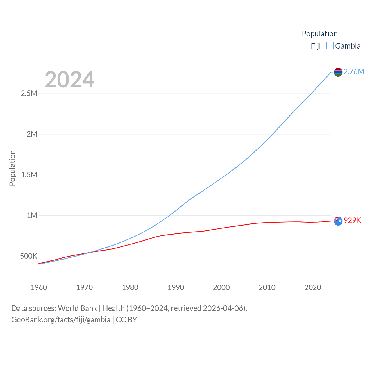 Fiji has a population of 929K (ranked 159/197), compared with 2.76M in The Gambia (ranked 140/197). Fiji's land area is 7,054 sq mi versus 3,907 sq mi for The Gambia (ranked 152nd vs. 161st).