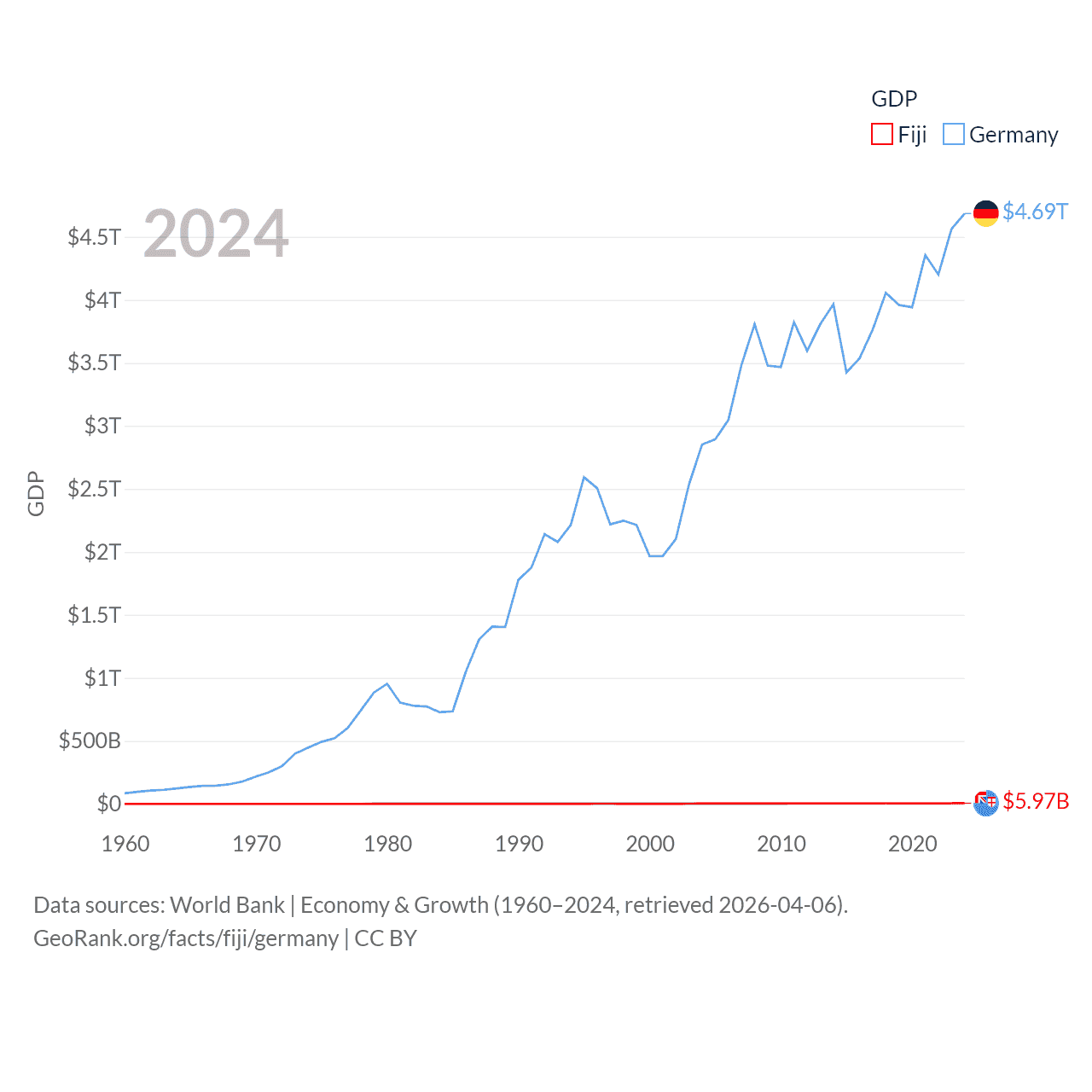 By GDP, Fiji ranks 161/197 ($5.97B) and Germany ranks 3/197 ($4.69T). By GDP per capita, Fiji ranks 108/197 ($6,426), while Germany ranks 19/197 ($56,104).