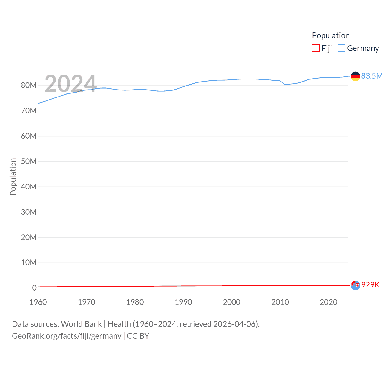 Fiji has a population of 929K (ranked 159/197), compared with 83.5M in Germany (ranked 19/197). Fiji's land area is 7,054 sq mi versus 134,916 sq mi for Germany (ranked 152nd vs. 63rd).
