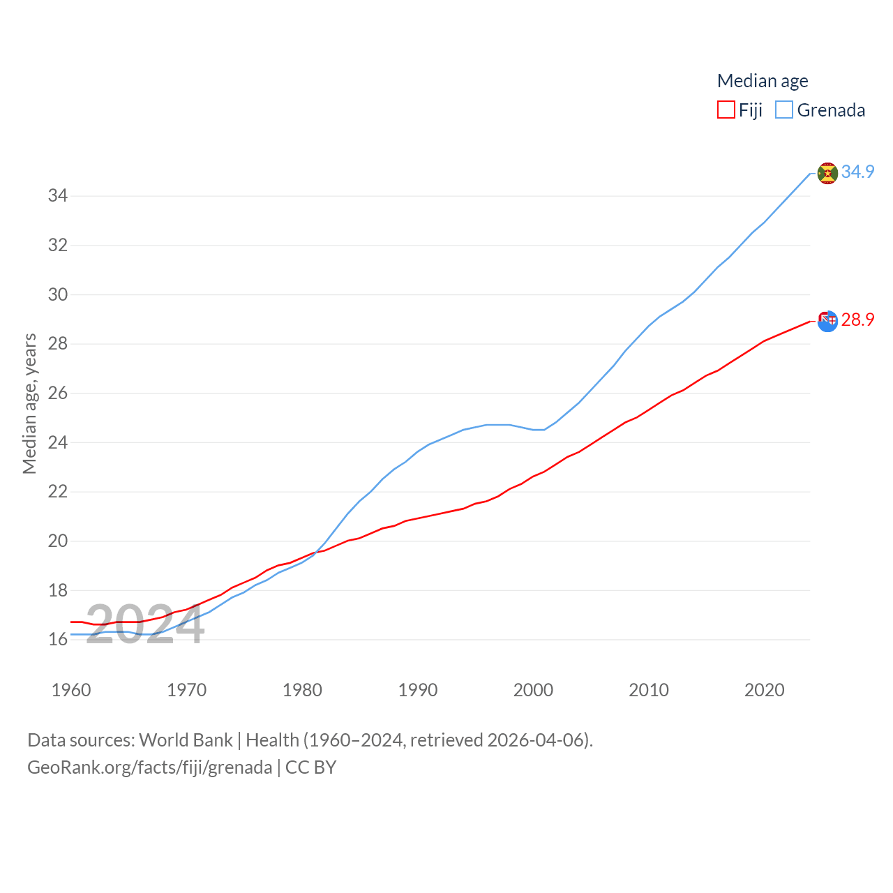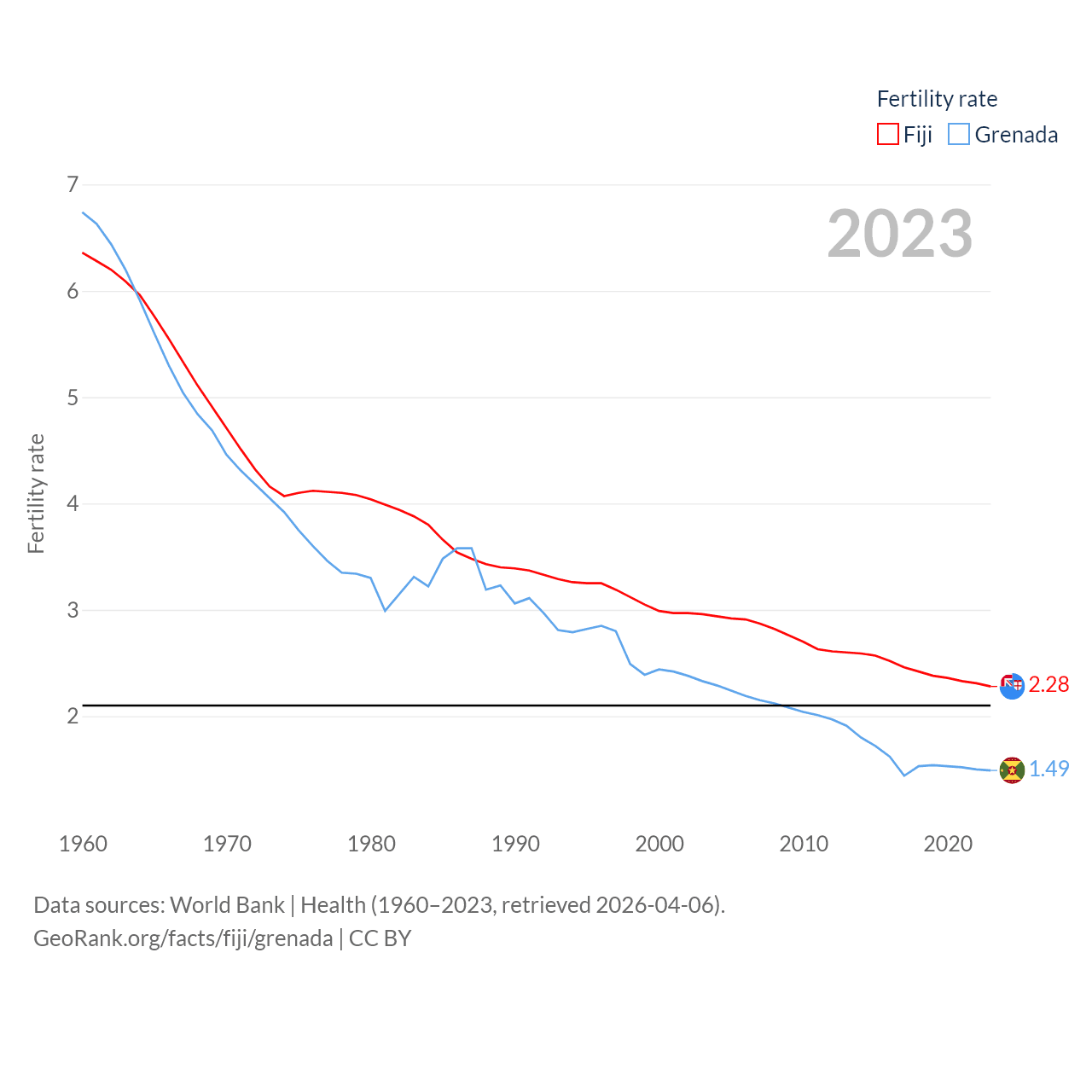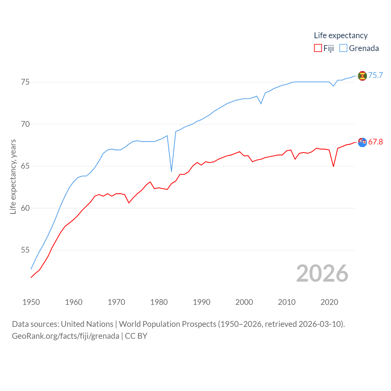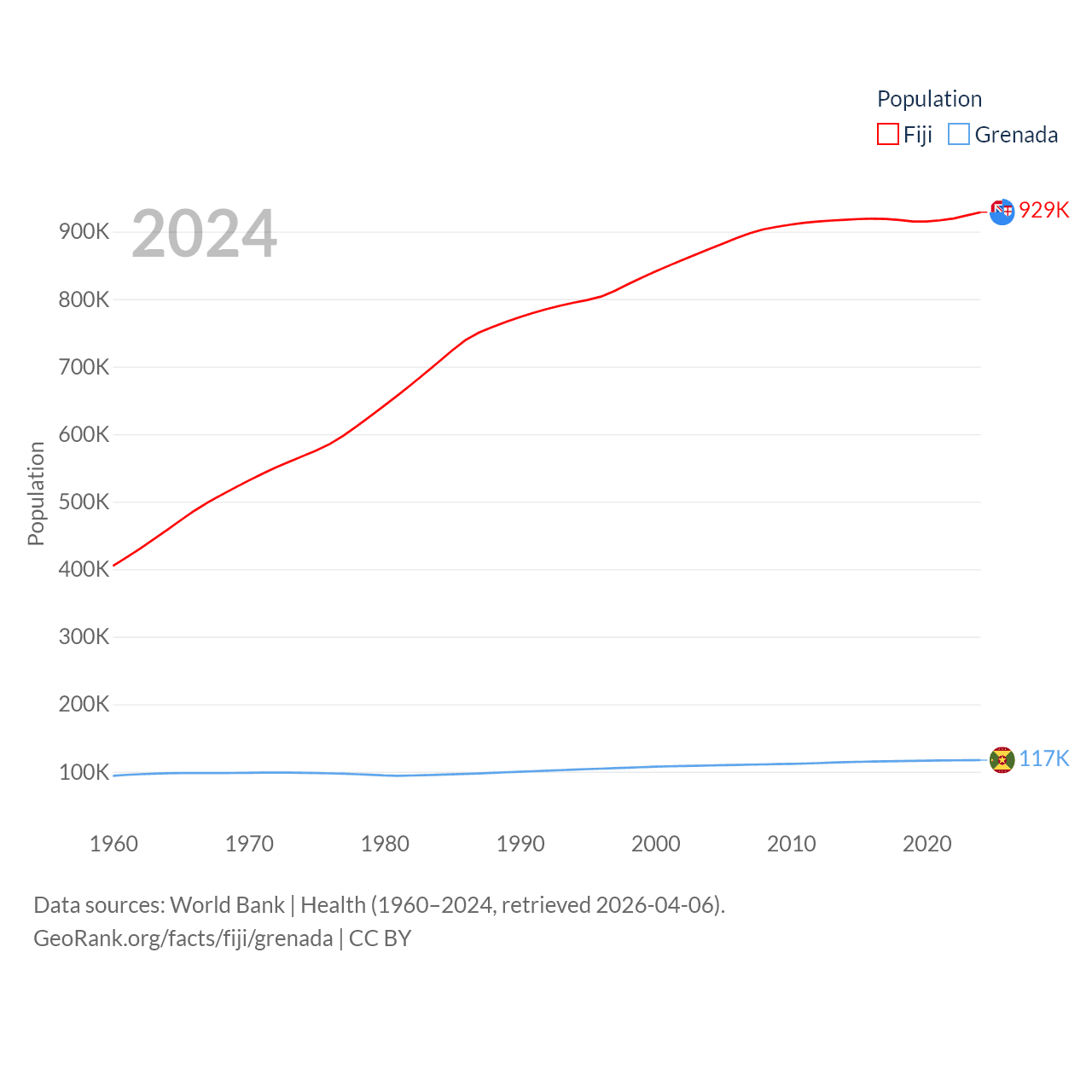 Fiji has a population of 929K (ranked 159/197), compared with 117K in Grenada (ranked 182/197). Fiji's land area is 7,054 sq mi versus 131.3 sq mi for Grenada (ranked 152nd vs. 186th).