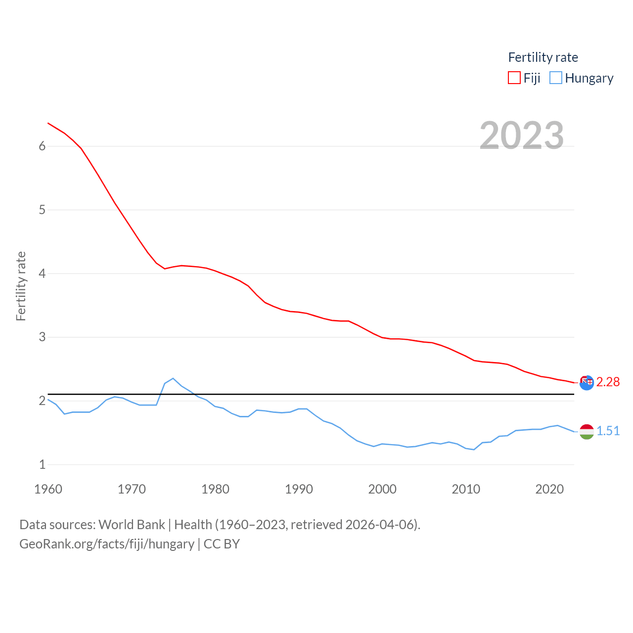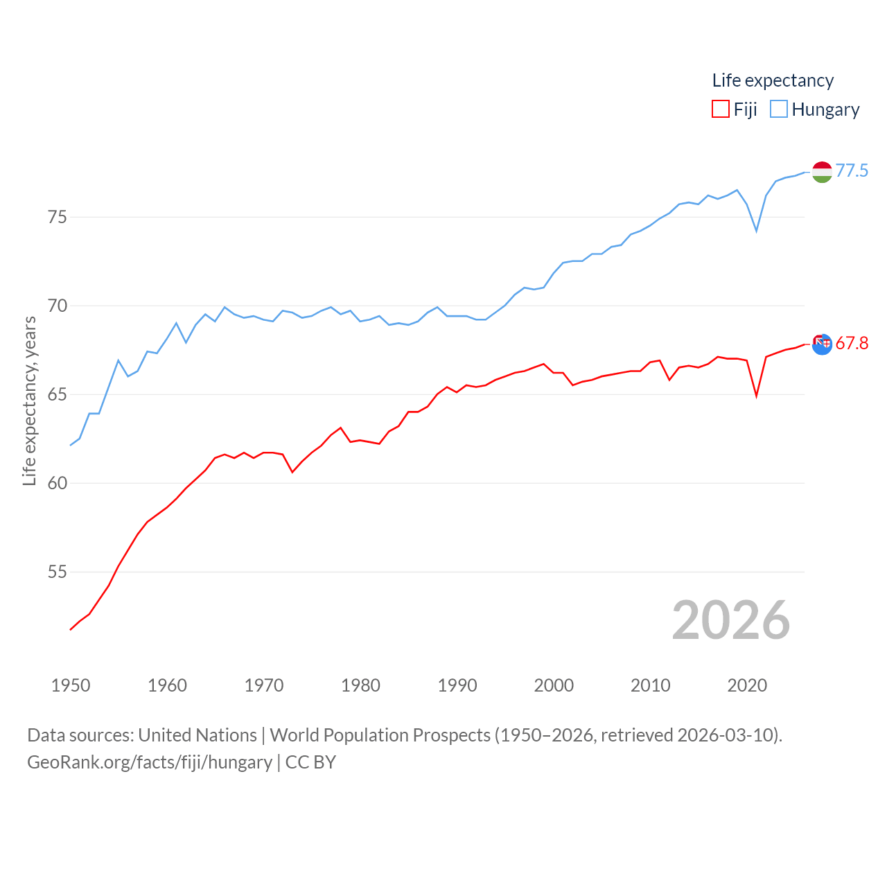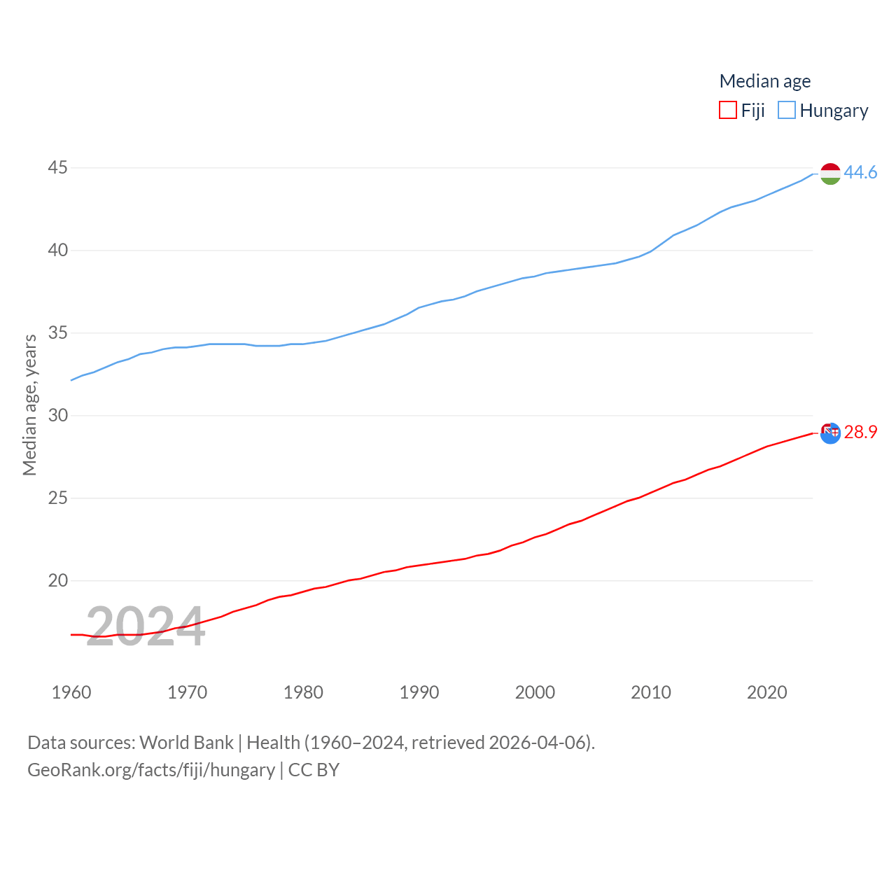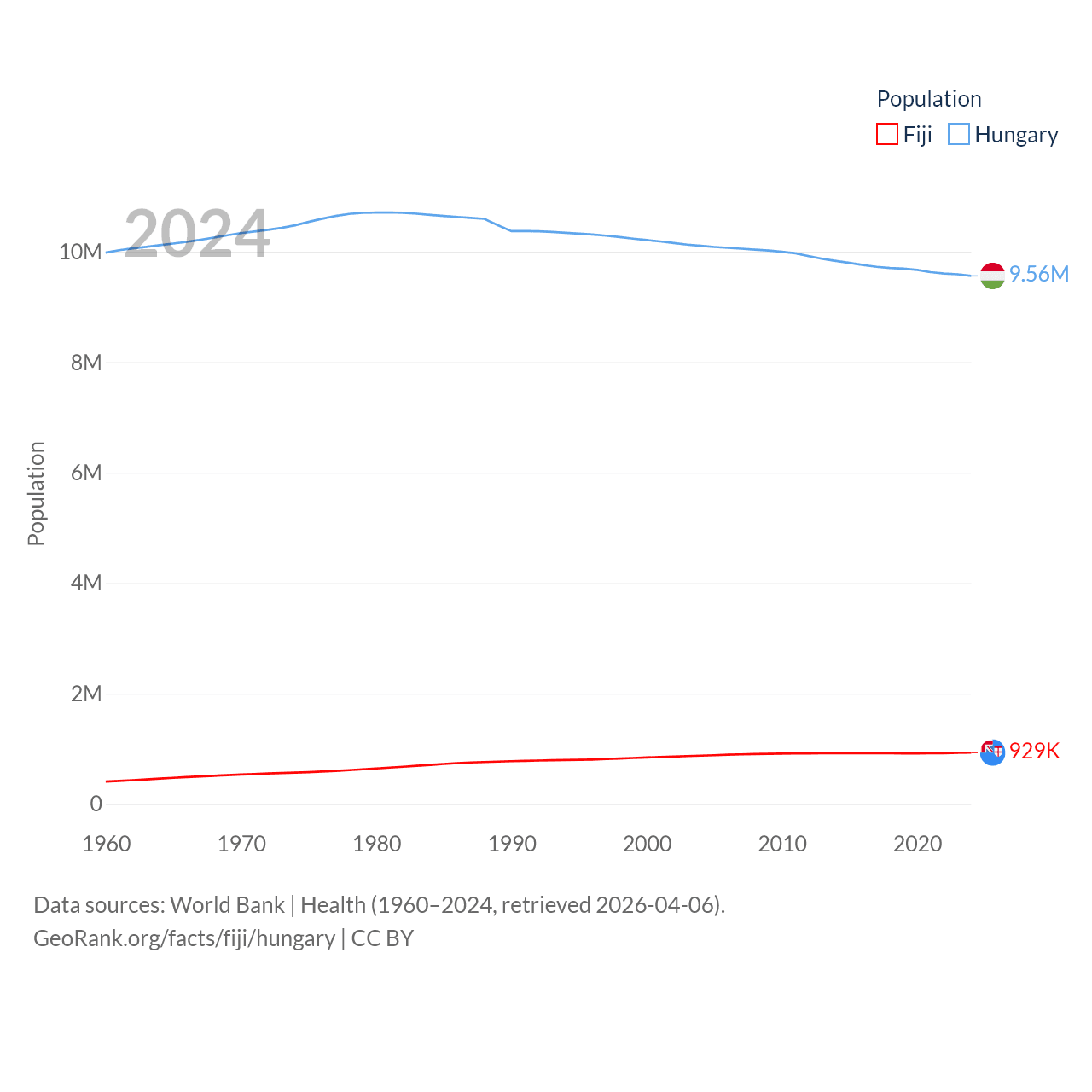 Fiji has a population of 929K (ranked 159/197), compared with 9.56M in Hungary (ranked 97/197). Fiji's land area is 7,054 sq mi versus 35,236 sq mi for Hungary (ranked 152nd vs. 109th).