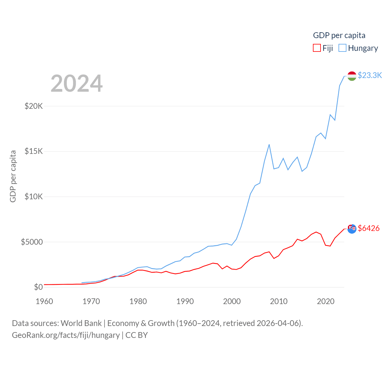 By GDP, Fiji ranks 161/197 ($5.97B) and Hungary ranks 55/197 ($223B). By GDP per capita, Fiji ranks 108/197 ($6,426), while Hungary ranks 55/197 ($23,292).