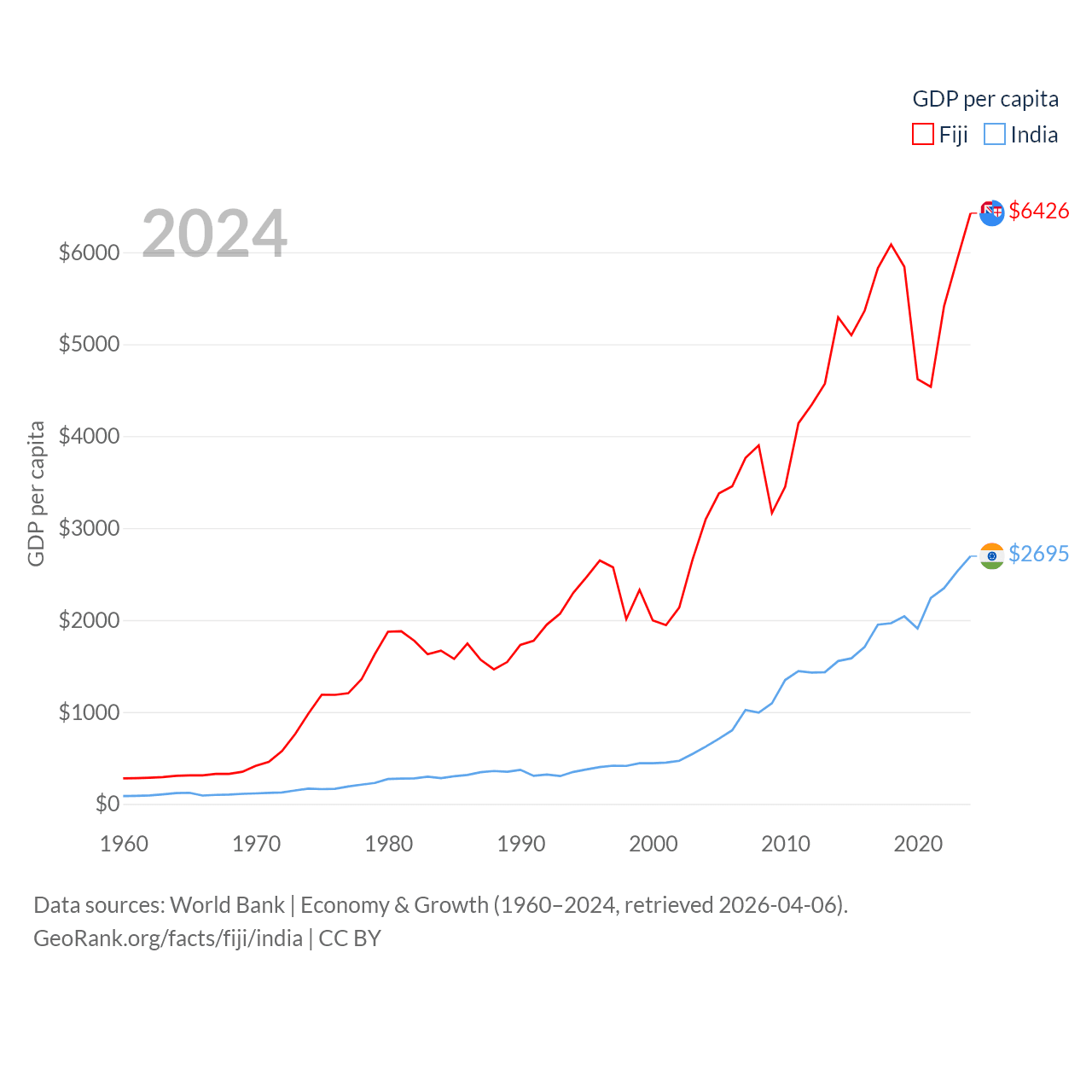 By GDP, Fiji ranks 161/197 ($5.97B) and India ranks 5/197 ($3.91T). By GDP per capita, Fiji ranks 108/197 ($6,426), while India ranks 143/197 ($2,695).