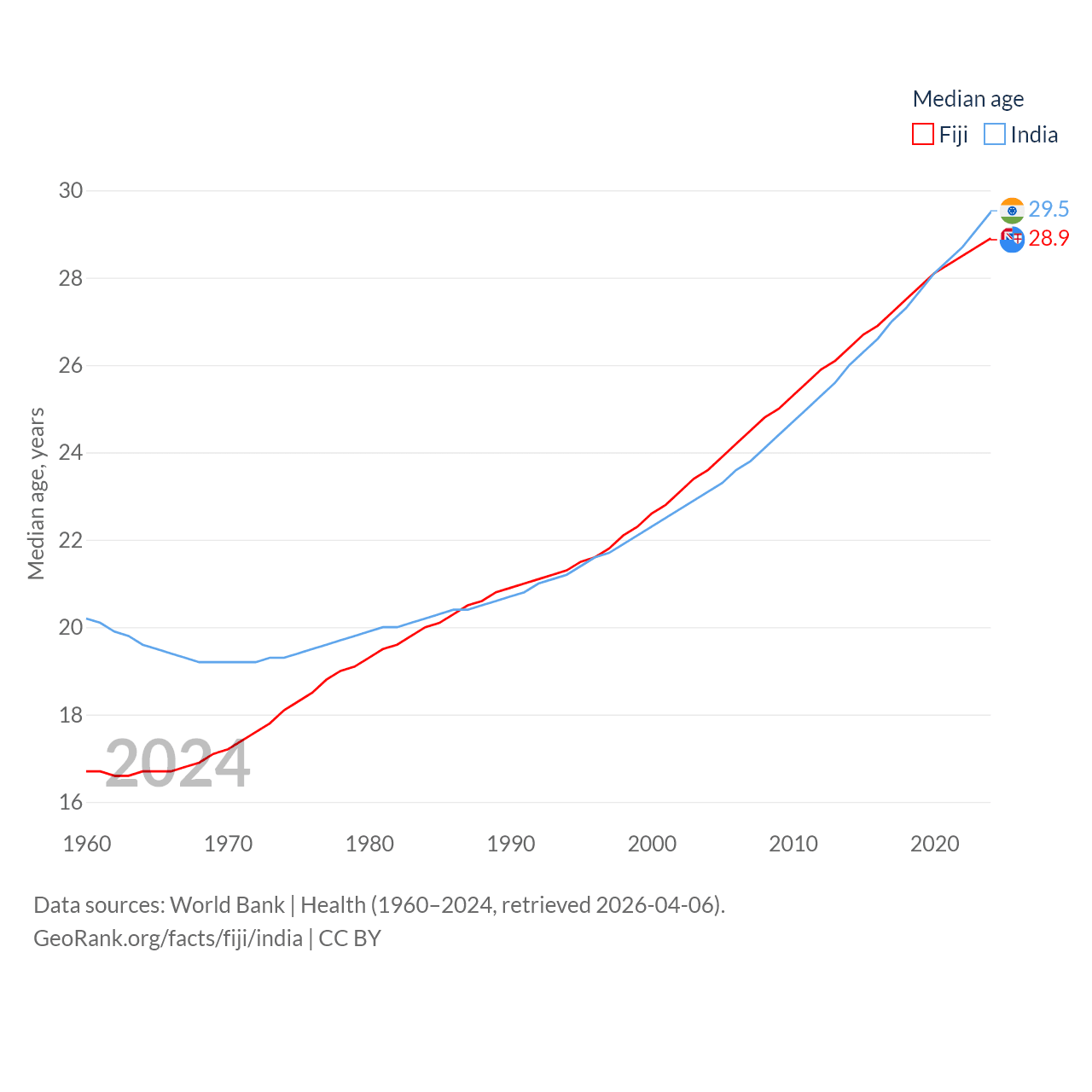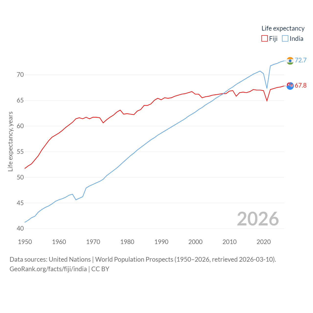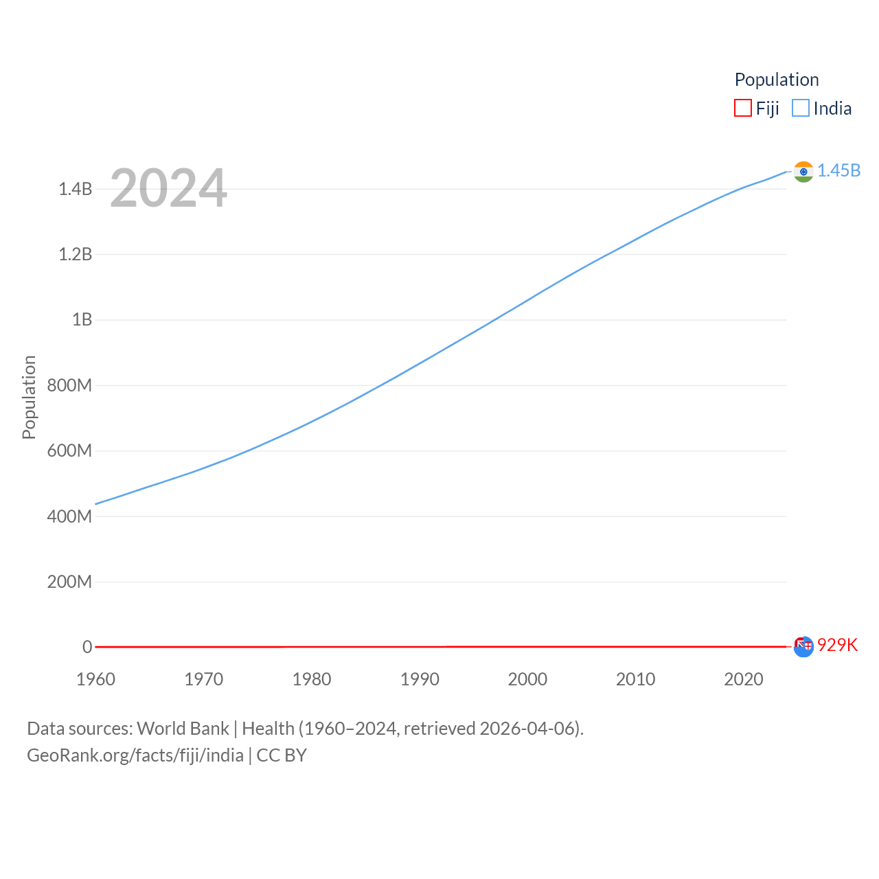 Fiji has a population of 929K (ranked 159/197), compared with 1.45B in India (ranked 1/197). Fiji's land area is 7,054 sq mi versus 1,147,955 sq mi for India (ranked 152nd vs. 7th).