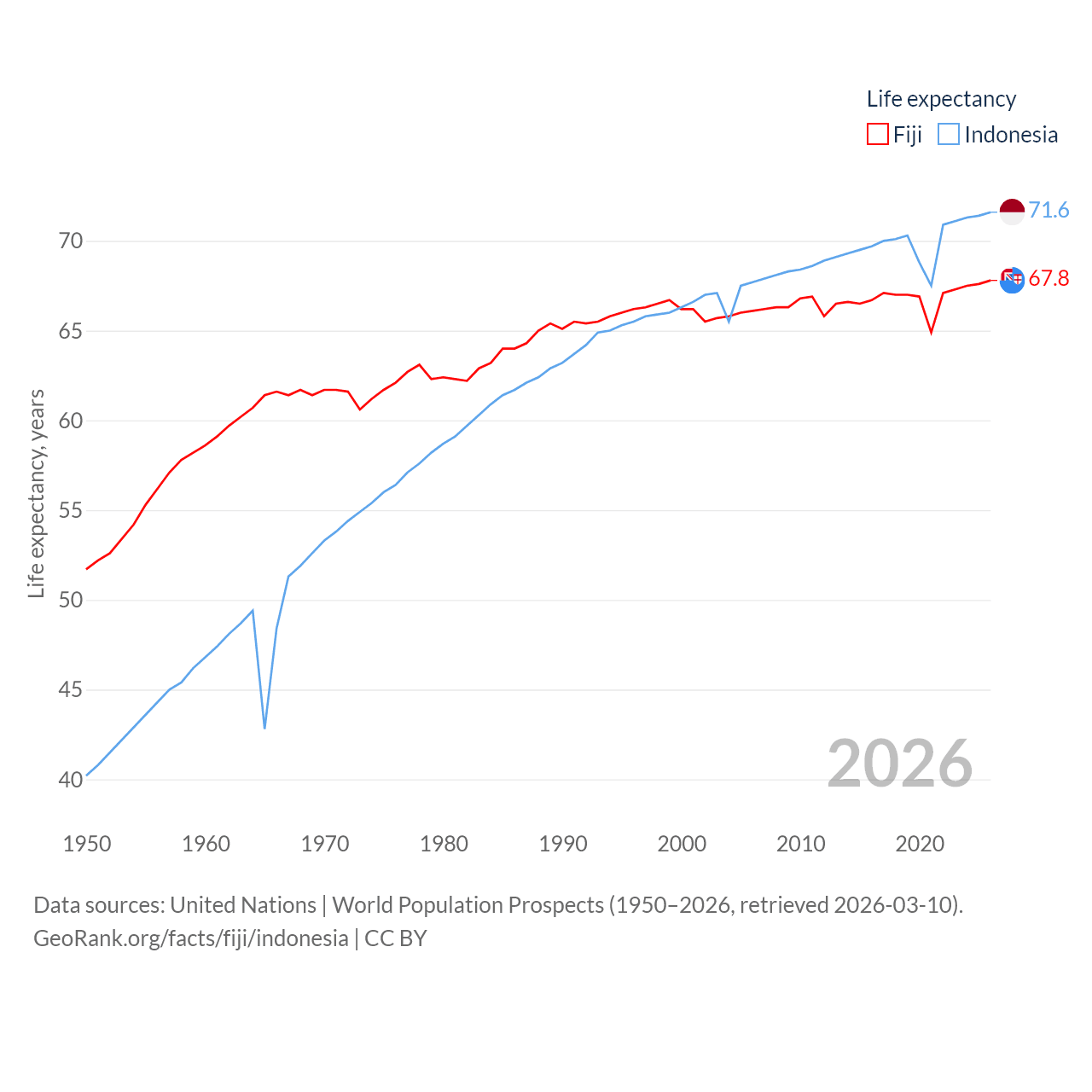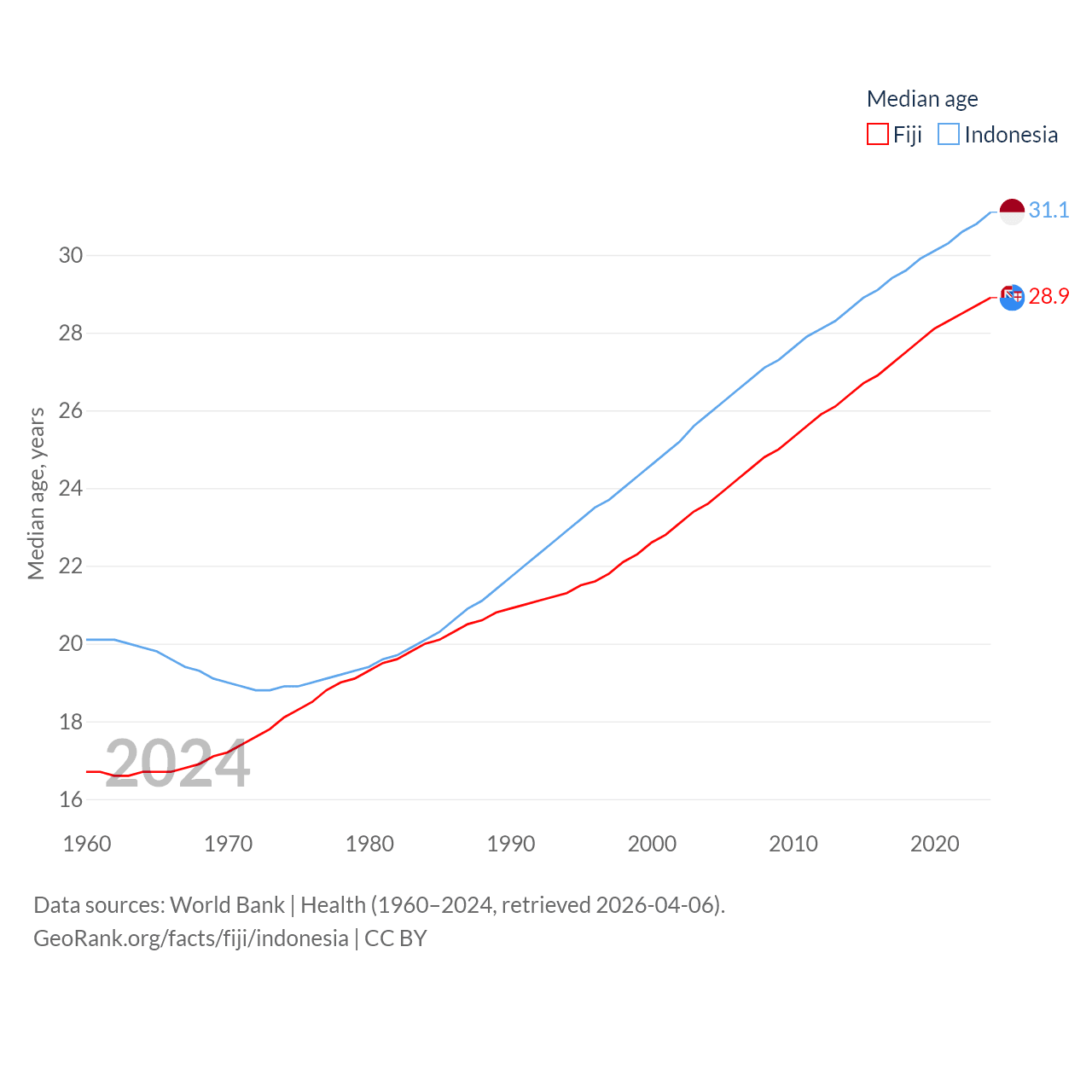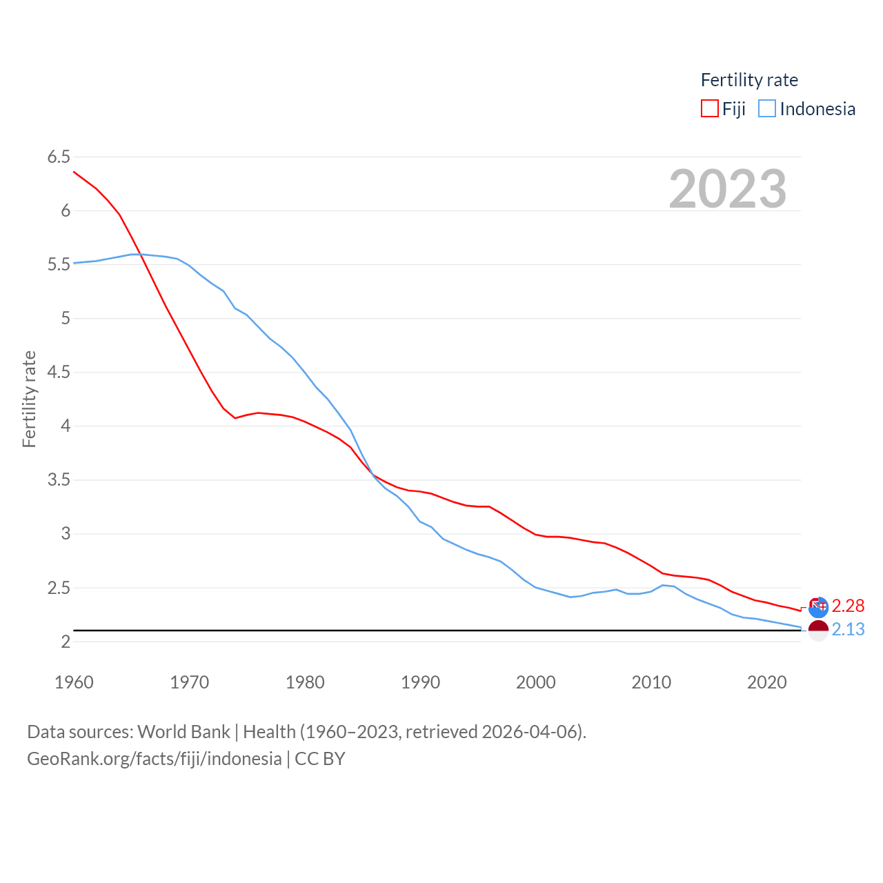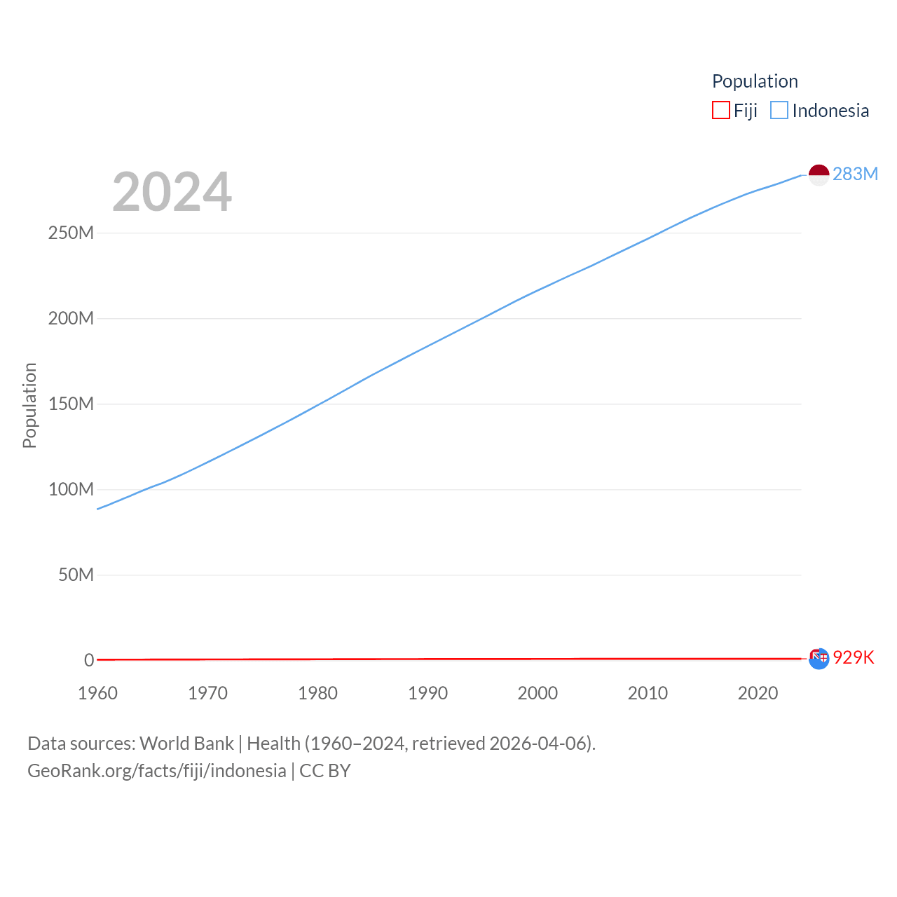 Fiji has a population of 929K (ranked 159/197), compared with 283M in Indonesia (ranked 4/197). Fiji's land area is 7,054 sq mi versus 730,720 sq mi for Indonesia (ranked 152nd vs. 14th).