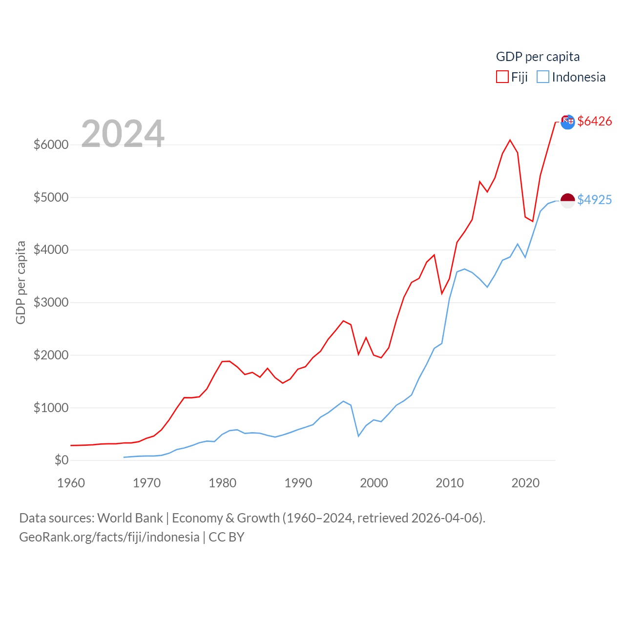 By GDP, Fiji ranks 161/197 ($5.97B) and Indonesia ranks 16/197 ($1.4T). By GDP per capita, Fiji ranks 108/197 ($6,426), while Indonesia ranks 121/197 ($4,925).