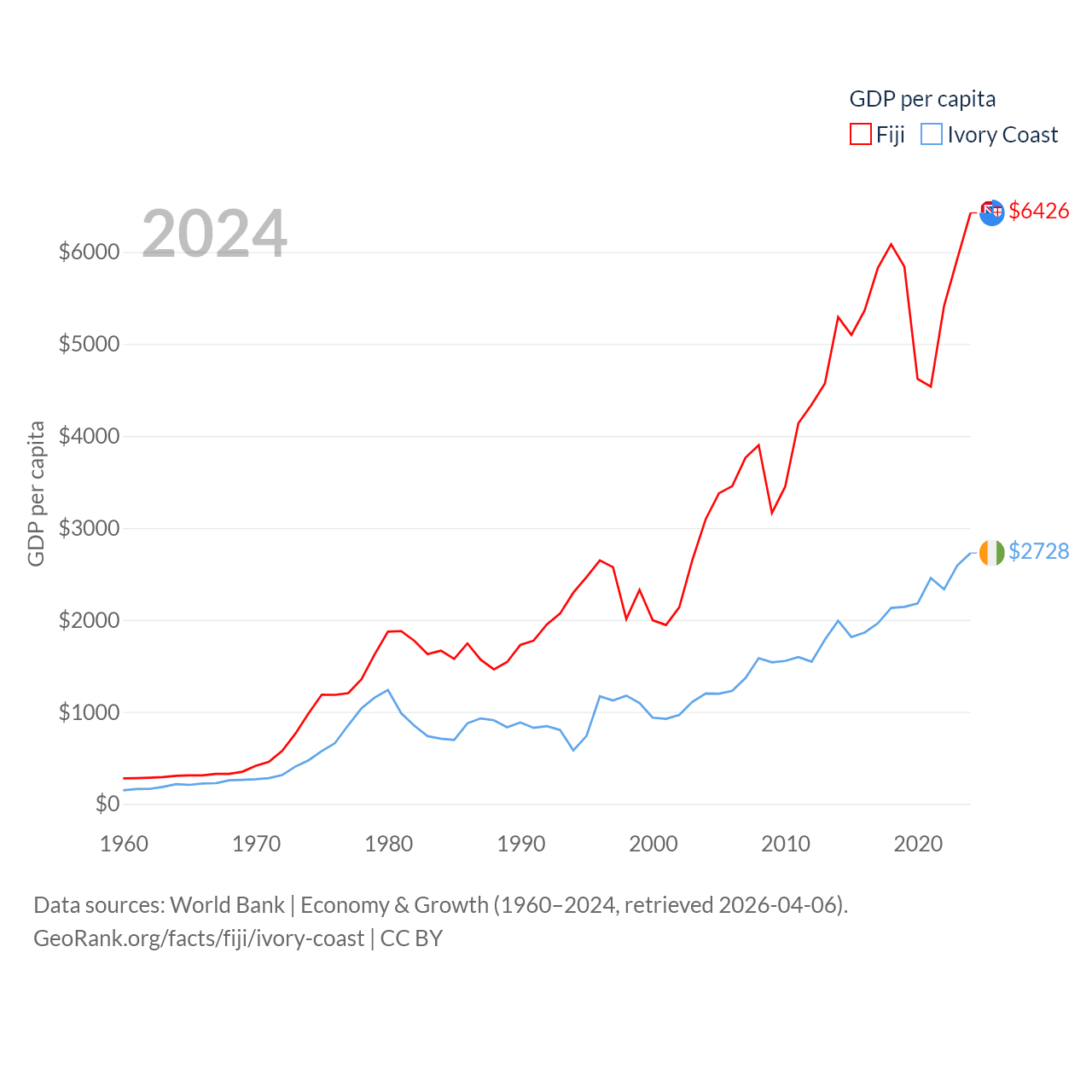 By GDP, Fiji ranks 161/197 ($5.97B) and Ivory Coast ranks 77/197 ($87.1B). By GDP per capita, Fiji ranks 108/197 ($6,426), while Ivory Coast ranks 142/197 ($2,728).