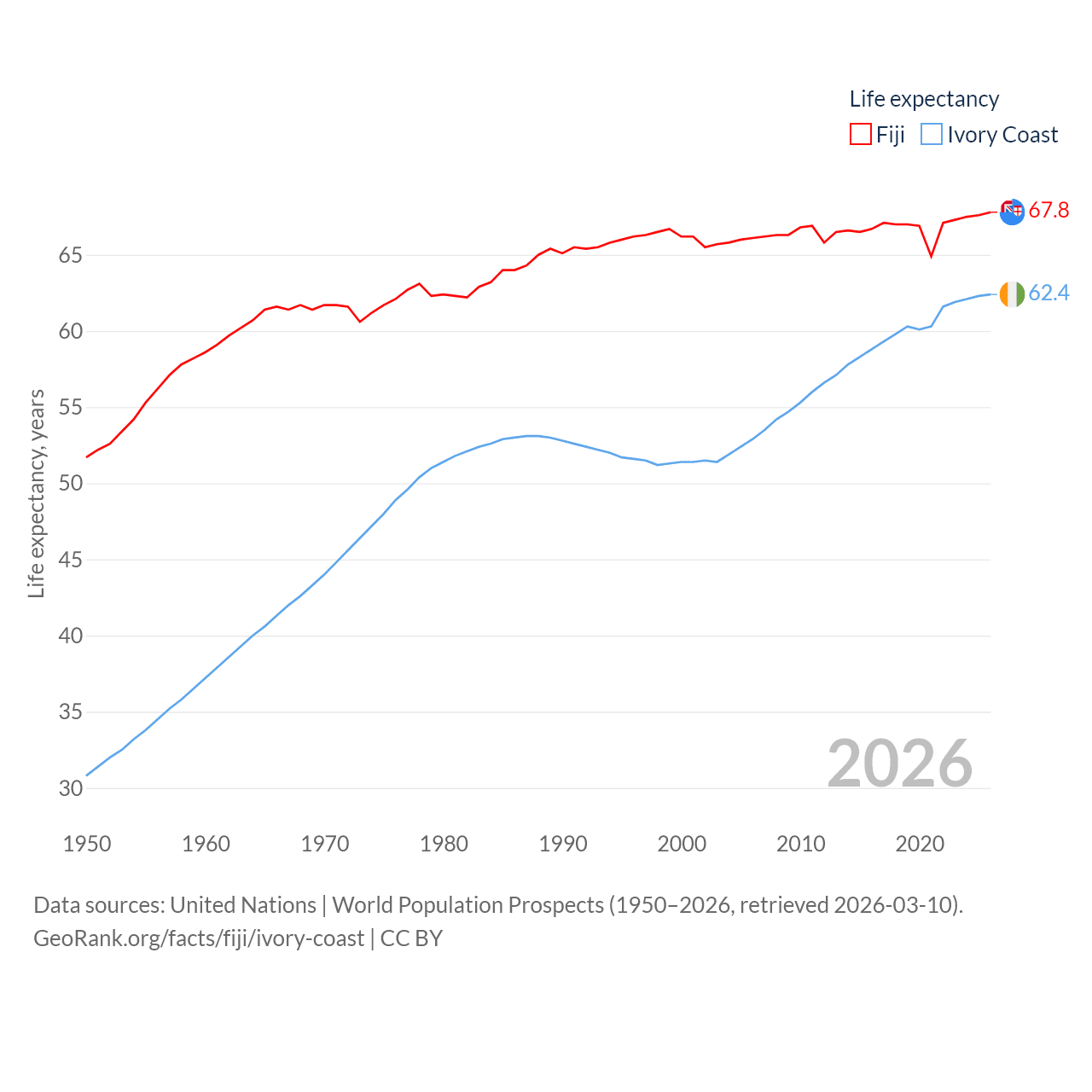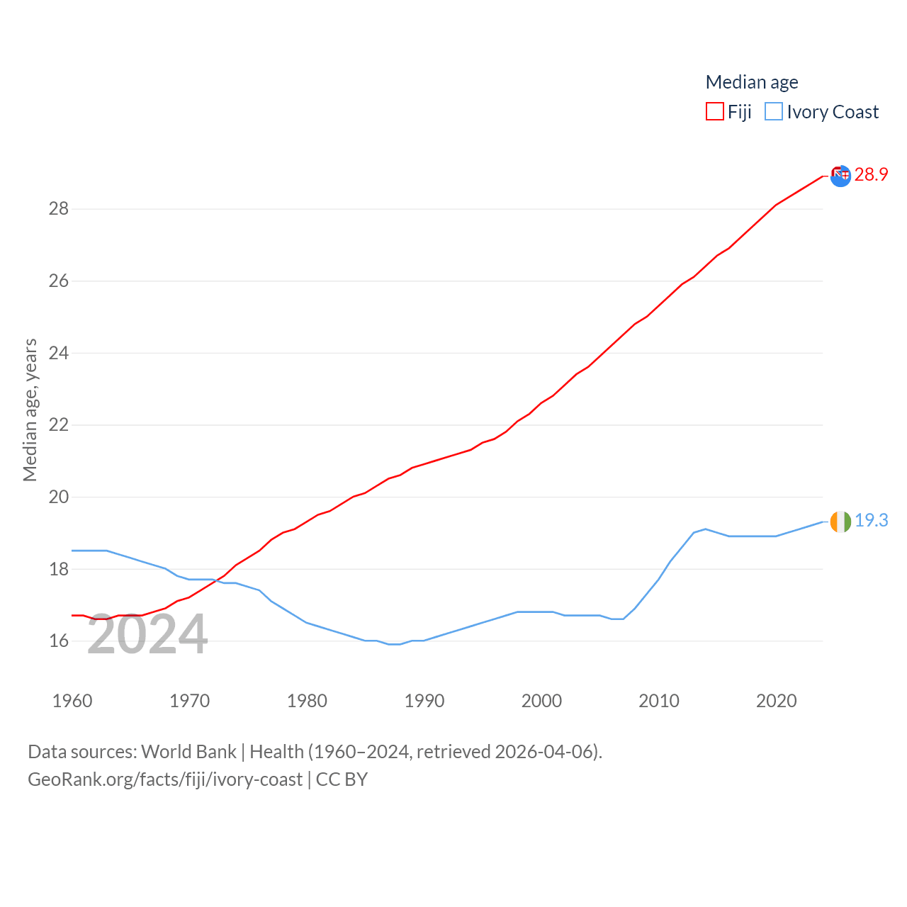 Fiji has a population of 929K (ranked 159/197), compared with 31.9M in Ivory Coast (ranked 50/197). Fiji's land area is 7,054 sq mi versus 122,780 sq mi for Ivory Coast (ranked 152nd vs. 66th).