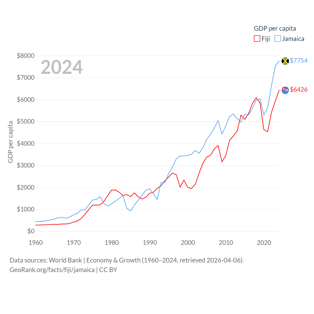By GDP, Fiji ranks 161/197 ($5.97B) and Jamaica ranks 124/197 ($22B). By GDP per capita, Fiji ranks 108/197 ($6,426), while Jamaica ranks 95/197 ($7,754).