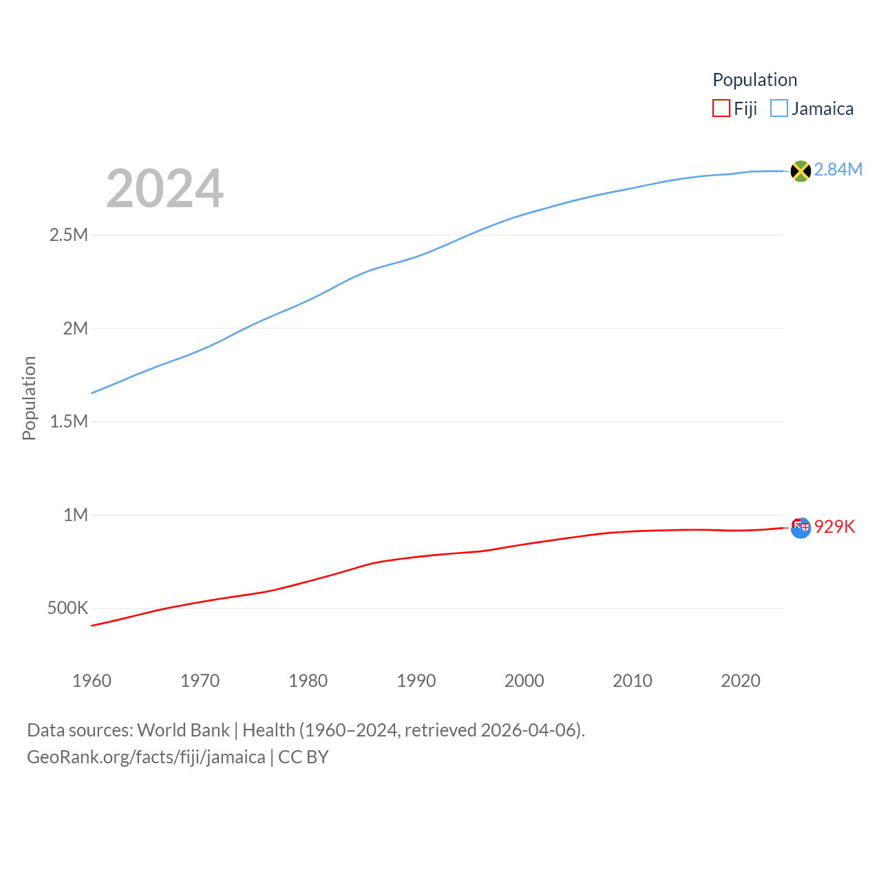 Fiji has a population of 929K (ranked 159/197), compared with 2.84M in Jamaica (ranked 139/197). Fiji's land area is 7,054 sq mi versus 4,181 sq mi for Jamaica (ranked 152nd vs. 159th).