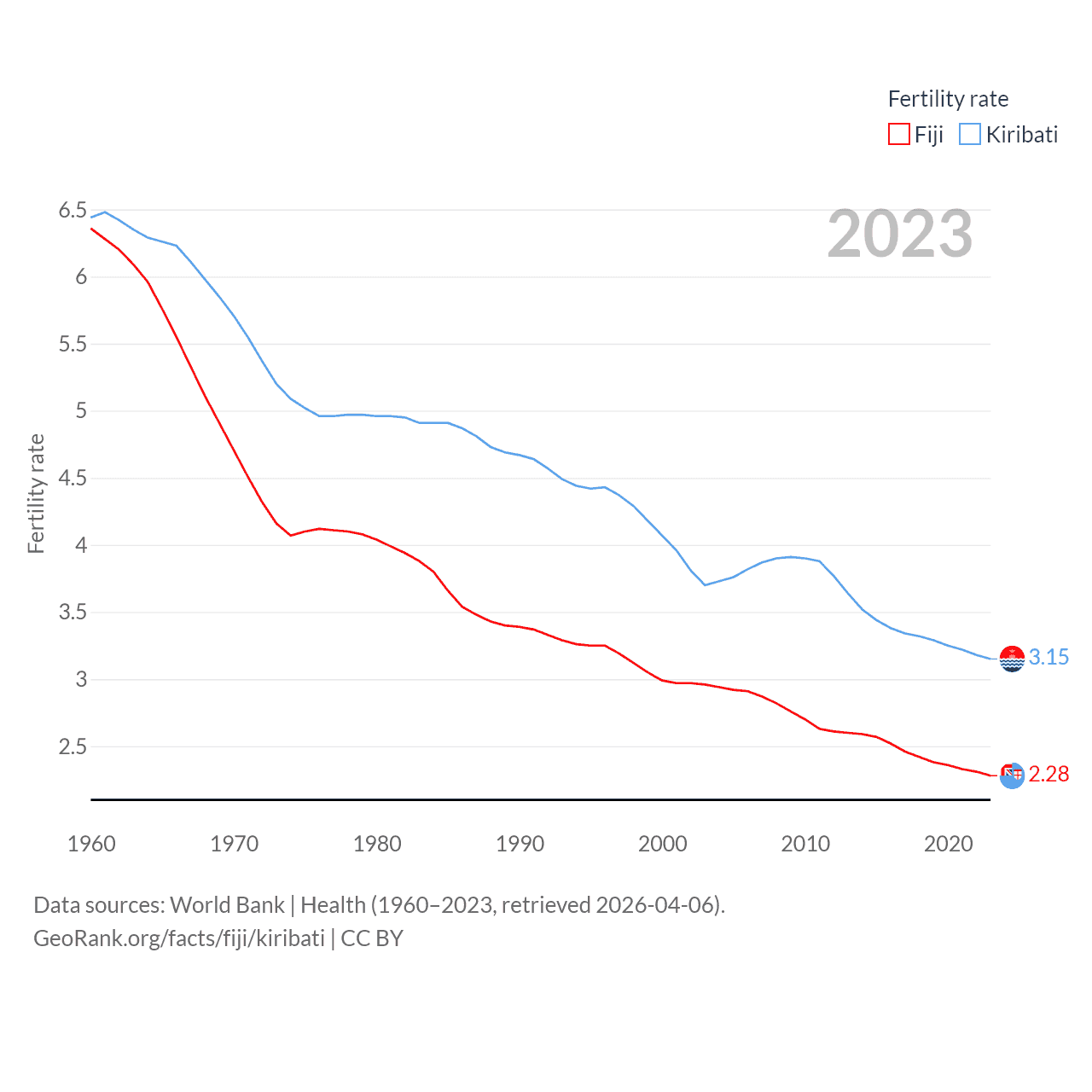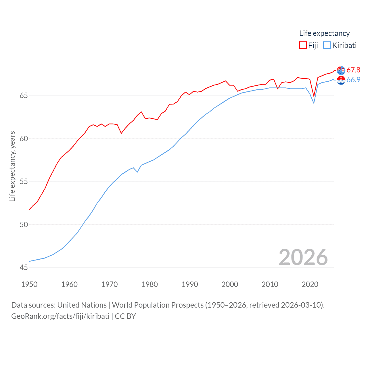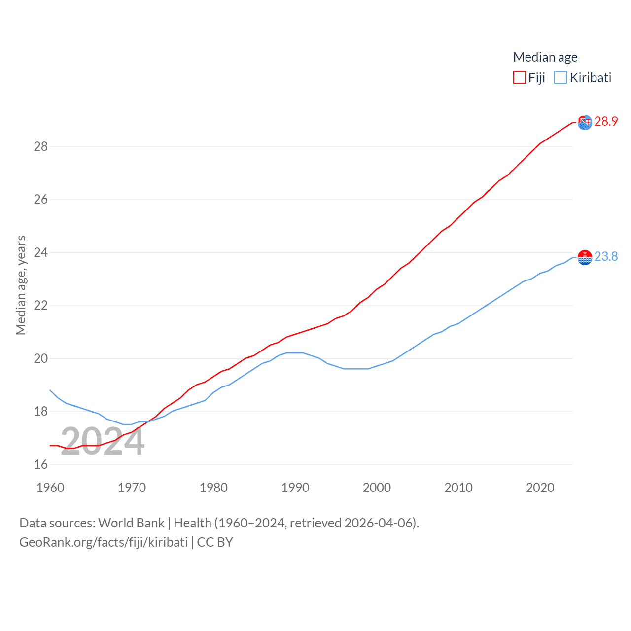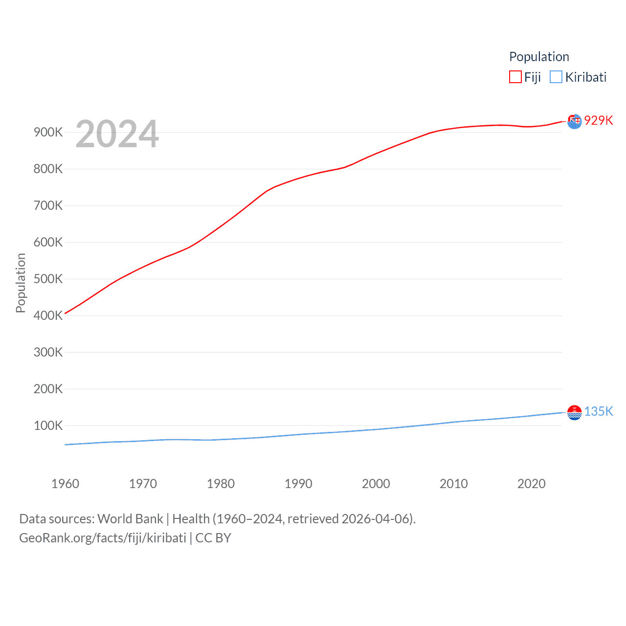 Fiji has a population of 929K (ranked 159/197), compared with 135K in Kiribati (ranked 180/197). Fiji's land area is 7,054 sq mi versus 313 sq mi for Kiribati (ranked 152nd vs. 173rd).