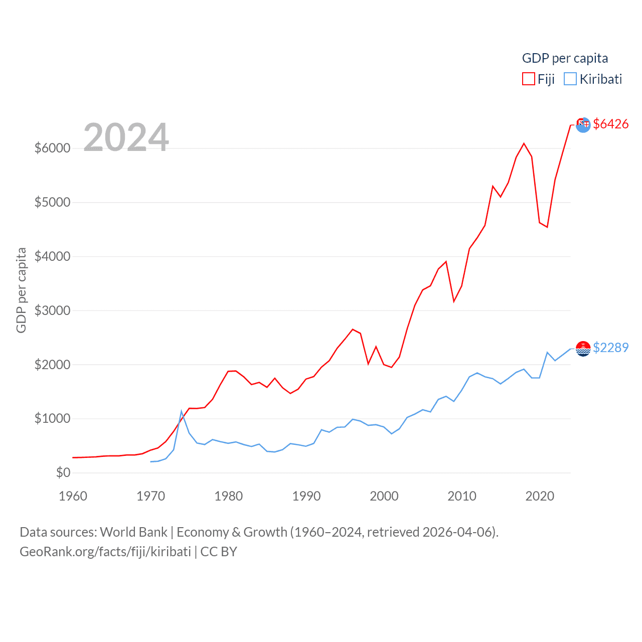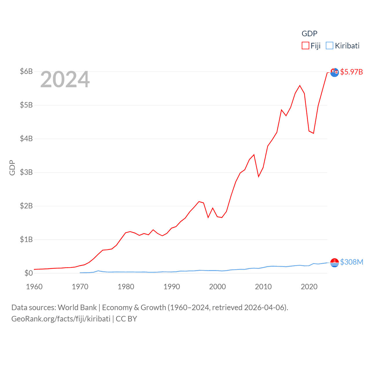 By GDP, Fiji ranks 161/197 ($5.97B) and Kiribati ranks 192/197 ($308M). By GDP per capita, Fiji ranks 108/197 ($6,426), while Kiribati ranks 152/197 ($2,289).