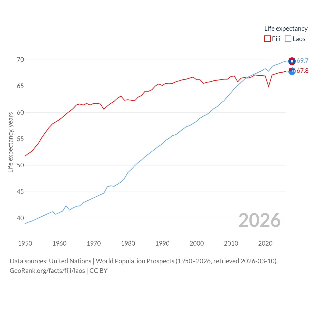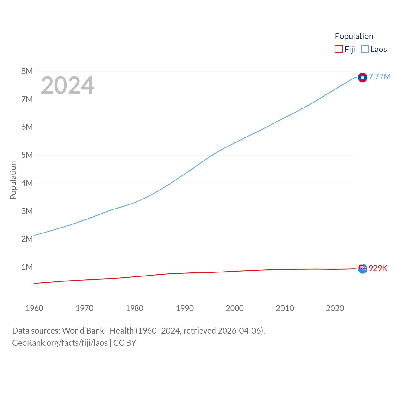 Fiji has a population of 929K (ranked 159/197), compared with 7.77M in Laos (ranked 103/197). Fiji's land area is 7,054 sq mi versus 89,112 sq mi for Laos (ranked 152nd vs. 79th).