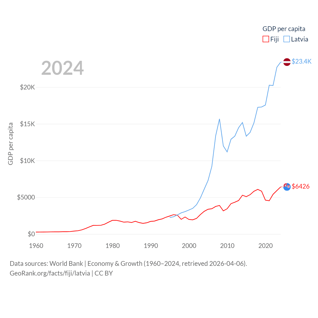 By GDP, Fiji ranks 161/197 ($5.97B) and Latvia ranks 99/197 ($43.7B). By GDP per capita, Fiji ranks 108/197 ($6,426), while Latvia ranks 54/197 ($23,409).
