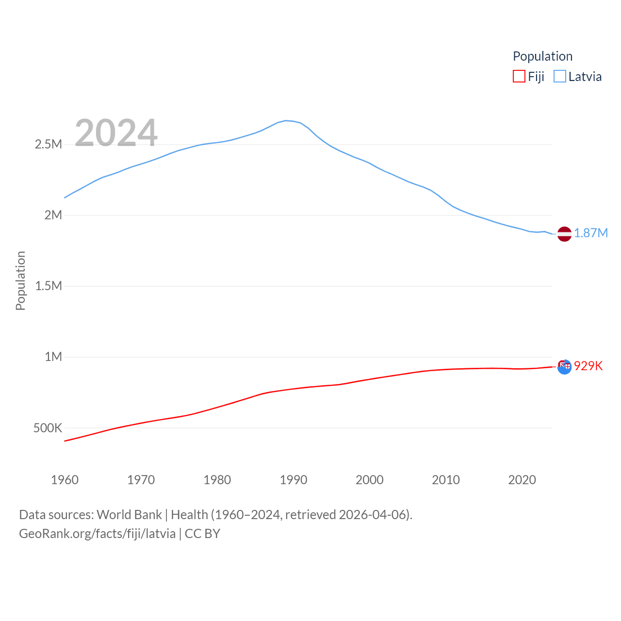 Fiji has a population of 929K (ranked 159/197), compared with 1.87M in Latvia (ranked 149/197). Fiji's land area is 7,054 sq mi versus 24,027 sq mi for Latvia (ranked 152nd vs. 121st).