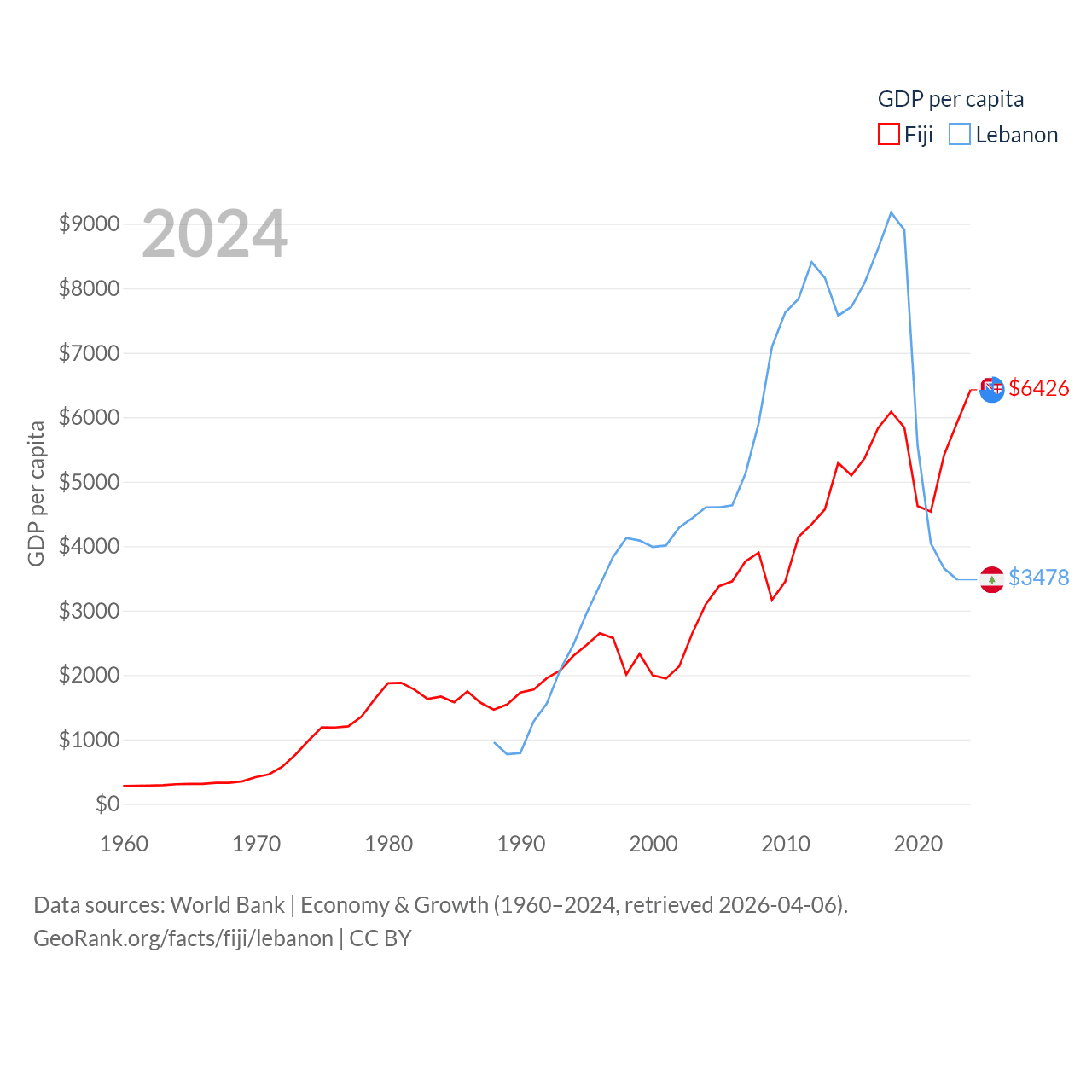 By GDP, Fiji ranks 161/197 ($5.97B) and Lebanon ranks 128/197 ($20.1B). By GDP per capita, Fiji ranks 108/197 ($6,426), while Lebanon ranks 135/197 ($3,478).