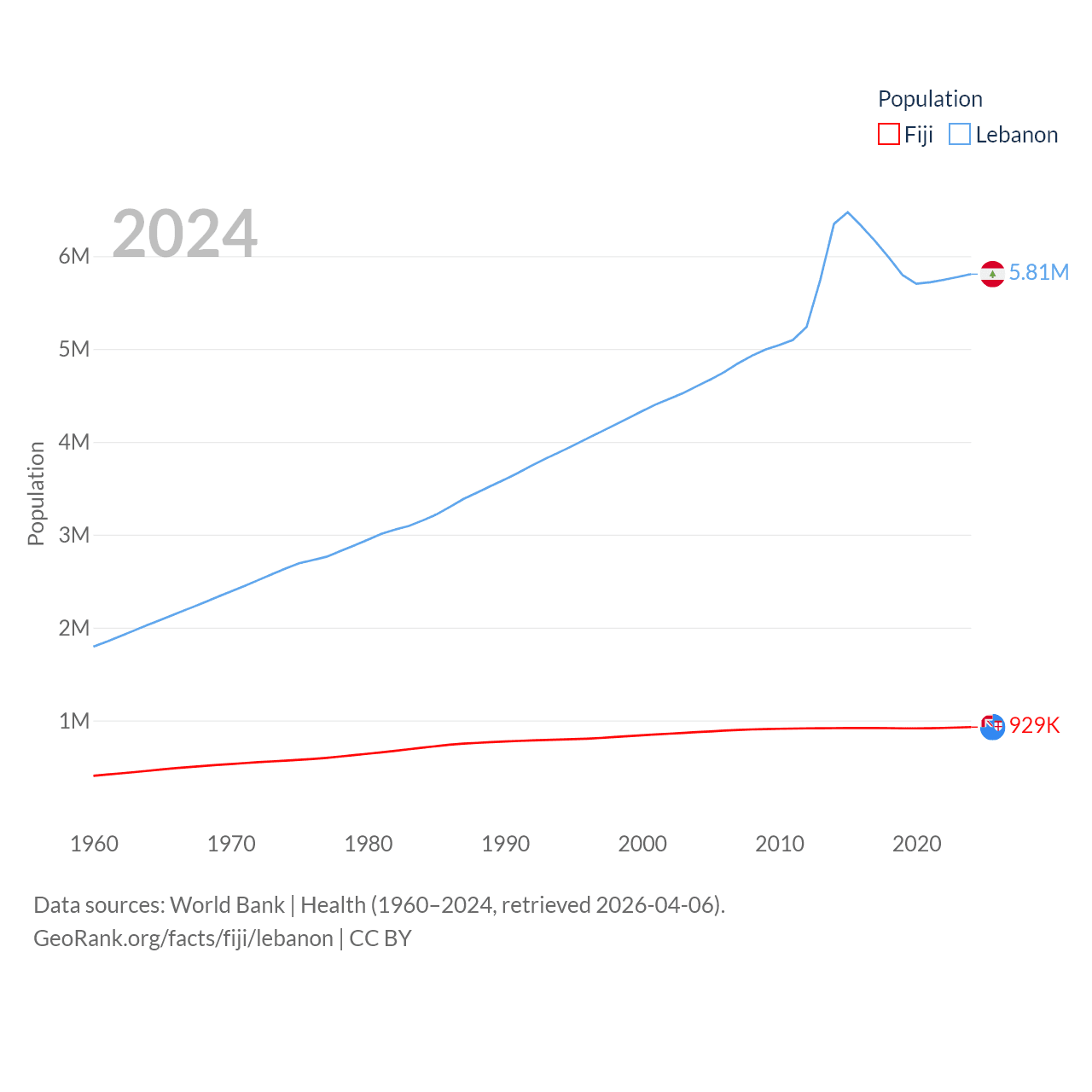Fiji has a population of 929K (ranked 159/197), compared with 5.81M in Lebanon (ranked 115/197). Fiji's land area is 7,054 sq mi versus 3,950 sq mi for Lebanon (ranked 152nd vs. 160th).